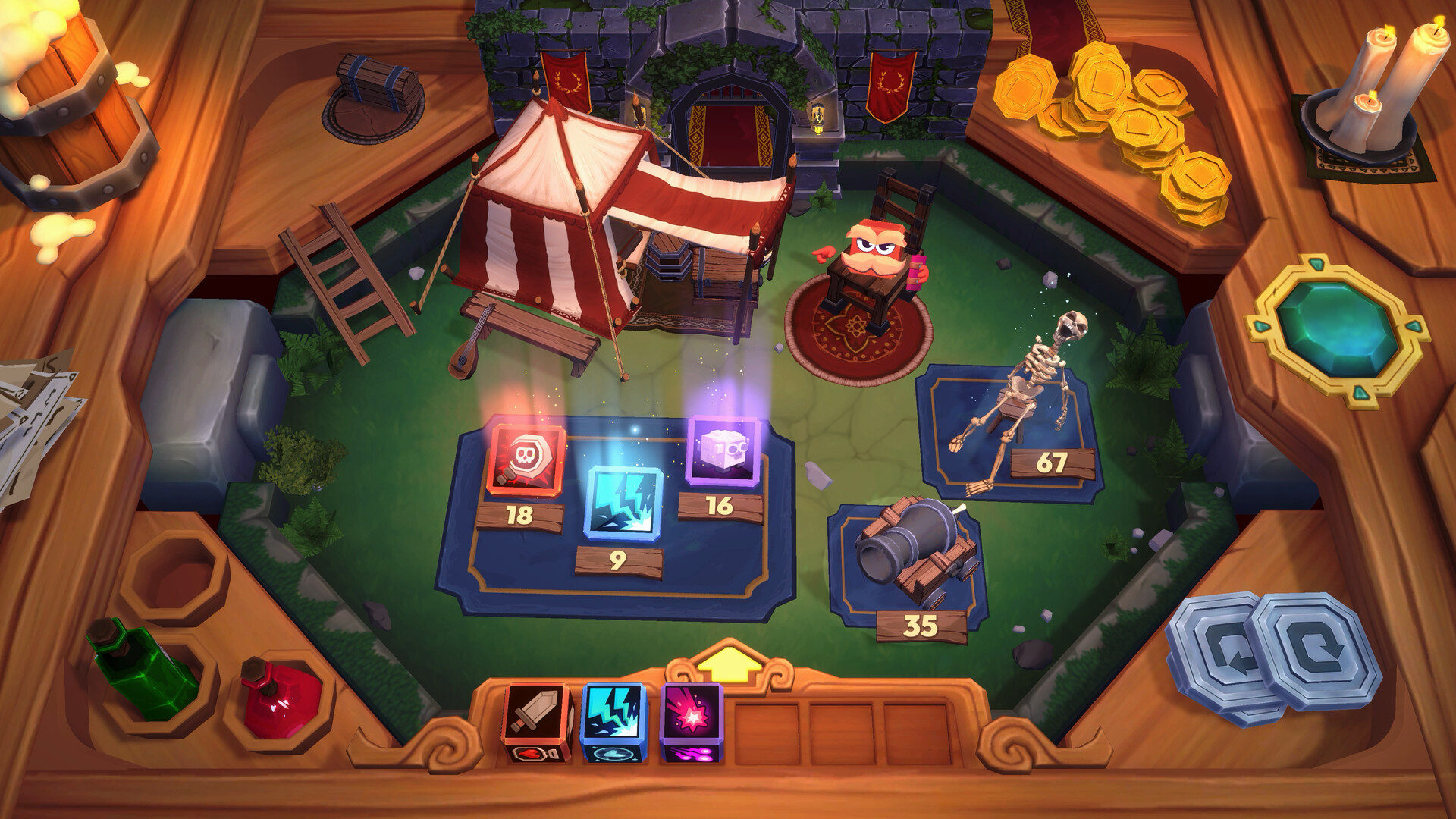 Battles play out automatically, but artifacts let you intervene. Catapult launches dice at backline threats or ballista takes out the last foe. Timing these tools can turn a losing fight into victory.