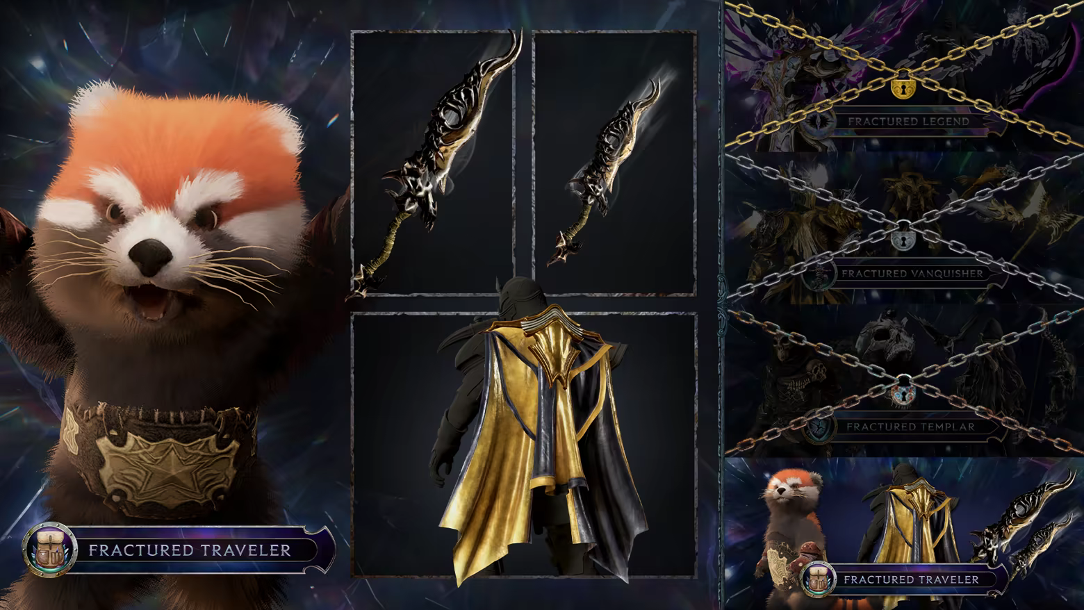 Embrace the shattered edges of time and reality. The Fractured Traveler pack marks your journey with relics of broken worlds, from keen Wraithblade weapons to the Eclipse Ascendant cloak, and Champ, 4x reigning End of Time wrestling companion who follows in your wake.