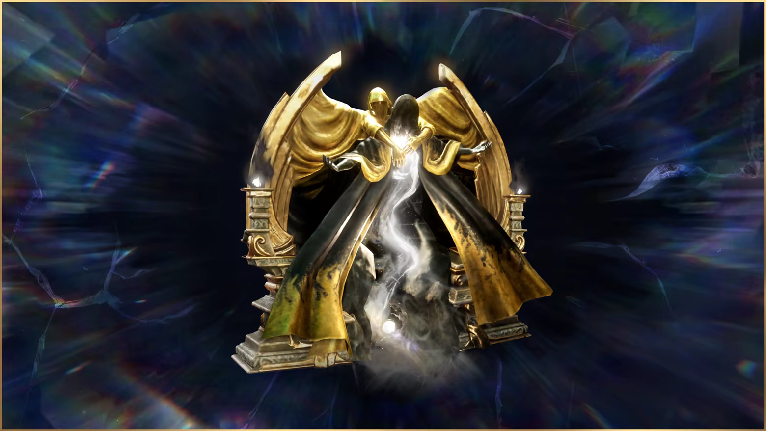 A grand portal framed by twin robed figures that lean toward a spiraling column of starlit mist, as if guiding you through the narrow path where light and darkness meet.