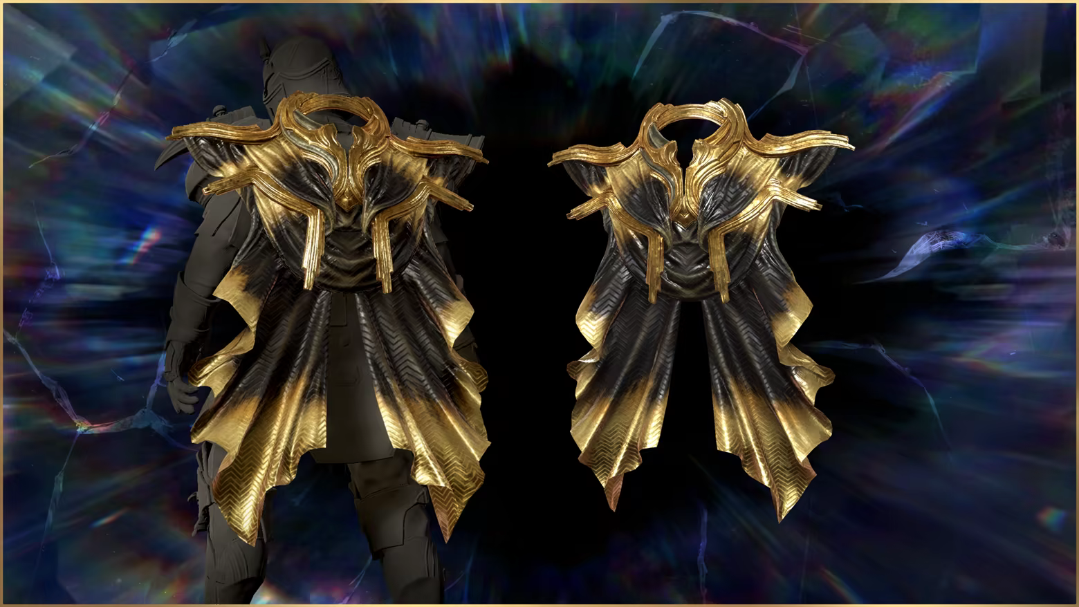A regal back piece that layers broad, sculpted plates and heavy cloth, with its outer edges darkened and its inner folds brightened, suggesting a cloak caught forever at totality.