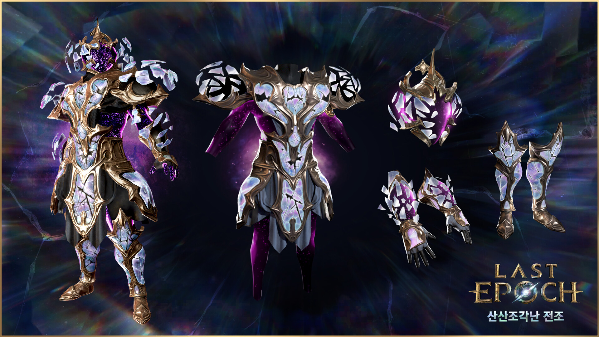 무지갯빛 수정과 암금속으로 빚어진 위압적인 갑옷이며, 톱니 모양의 균열 틈에서 보라색 공허의 빛이 새어 나옵니다. 어깨와 헬멧 주변에 느슨한 조각들이 떠다닙니다.