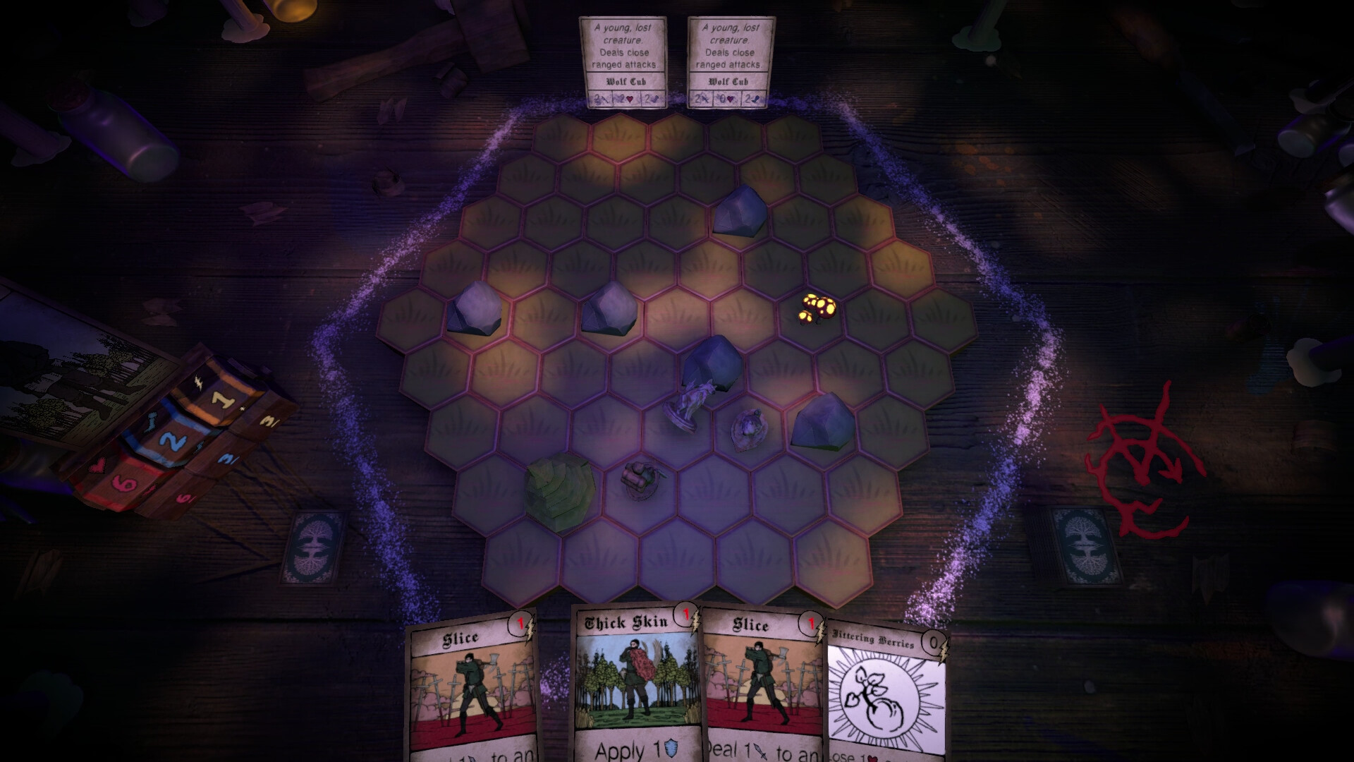 A deckbuilder at heart, The Grimwood Hex has a wide variety of cards to choose from. Each with their own synergies allowing for you to choose how you want to play. These are utilised in a unique, hex based, combat system where maneuverability and use of the environment are the difference between life and death.