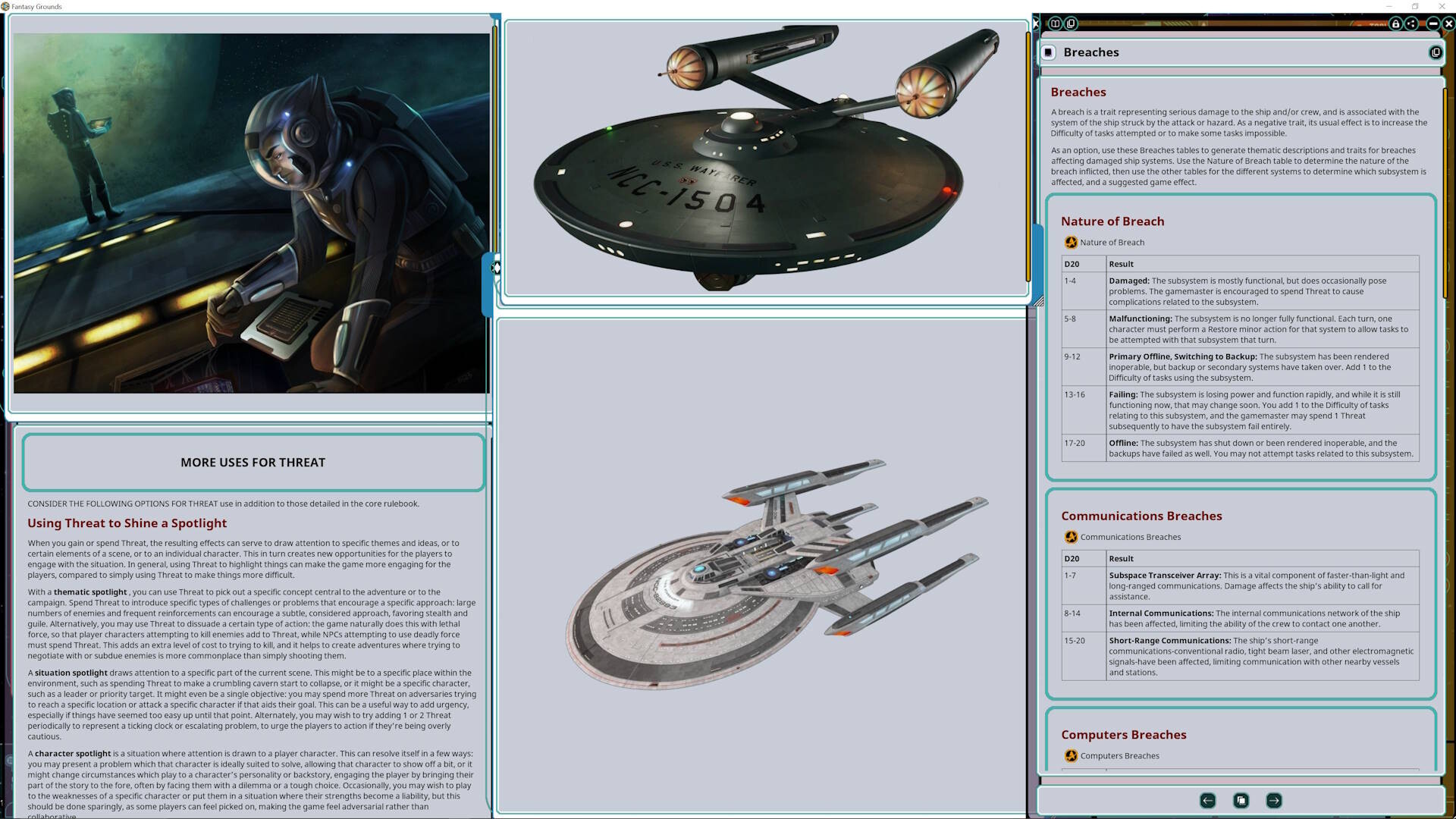 • 8 reference sheets including the actions of each role aboard a starship, Momentum spend reference tables, conflict rules references, and more.