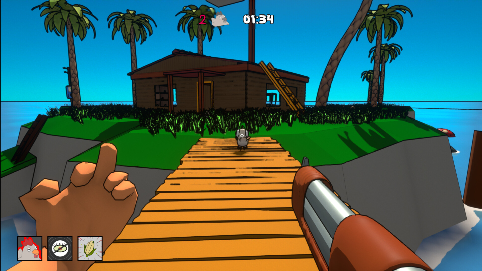 Must eliminate all the chickens before the match timer runs out. He has access to unique abilities to track the chickens’ positions or blur their screens, throw attraction grenades, and stretch his neck to gain a higher vantage point. All of this is combined with special interactive objects unique to each map, such as dividing the map into zones or turning off the lights.