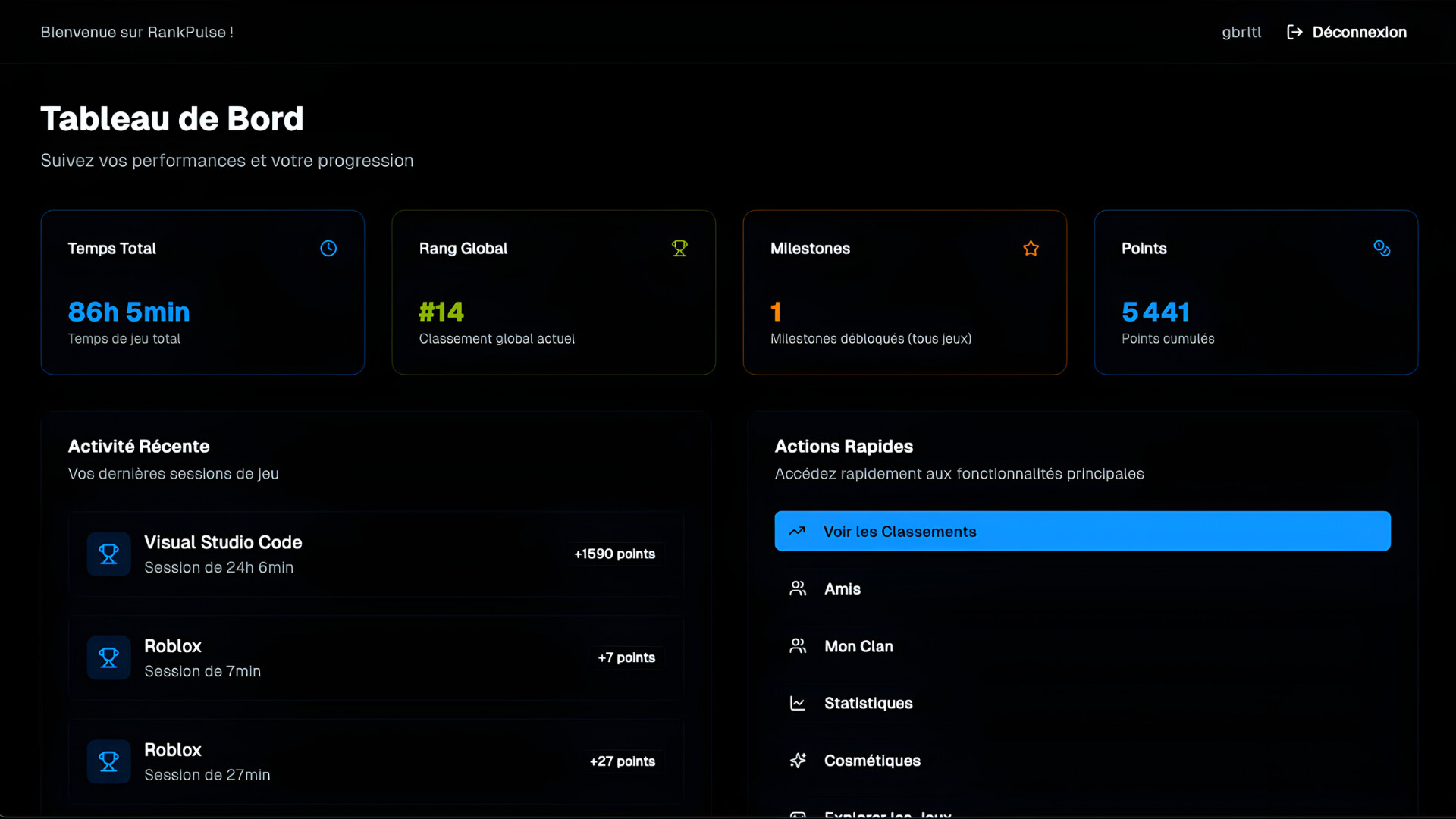RankPulse est l'outil ultime pour suivre votre temps de jeu, analyser vos stats et grimper dans les classements. Suivi automatique de tous vos jeux, visualisation détaillée de vos habitudes et compétition entre amis. De la data pure, de la vraie compétition.