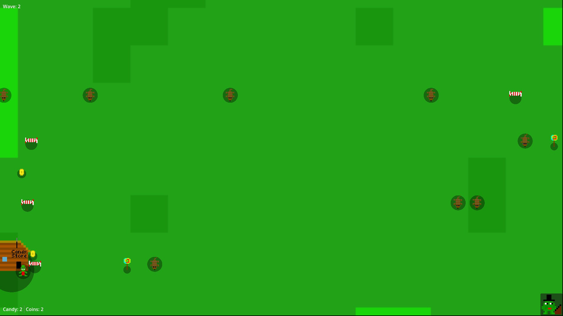 Move side to side outside the candy shop, dodge incoming enemies, and grab as much candy as you can. Sell your candy for coins, then spend those coins on upgrades to boost your survivability and earnings. The longer you last, the more chaotic it gets.