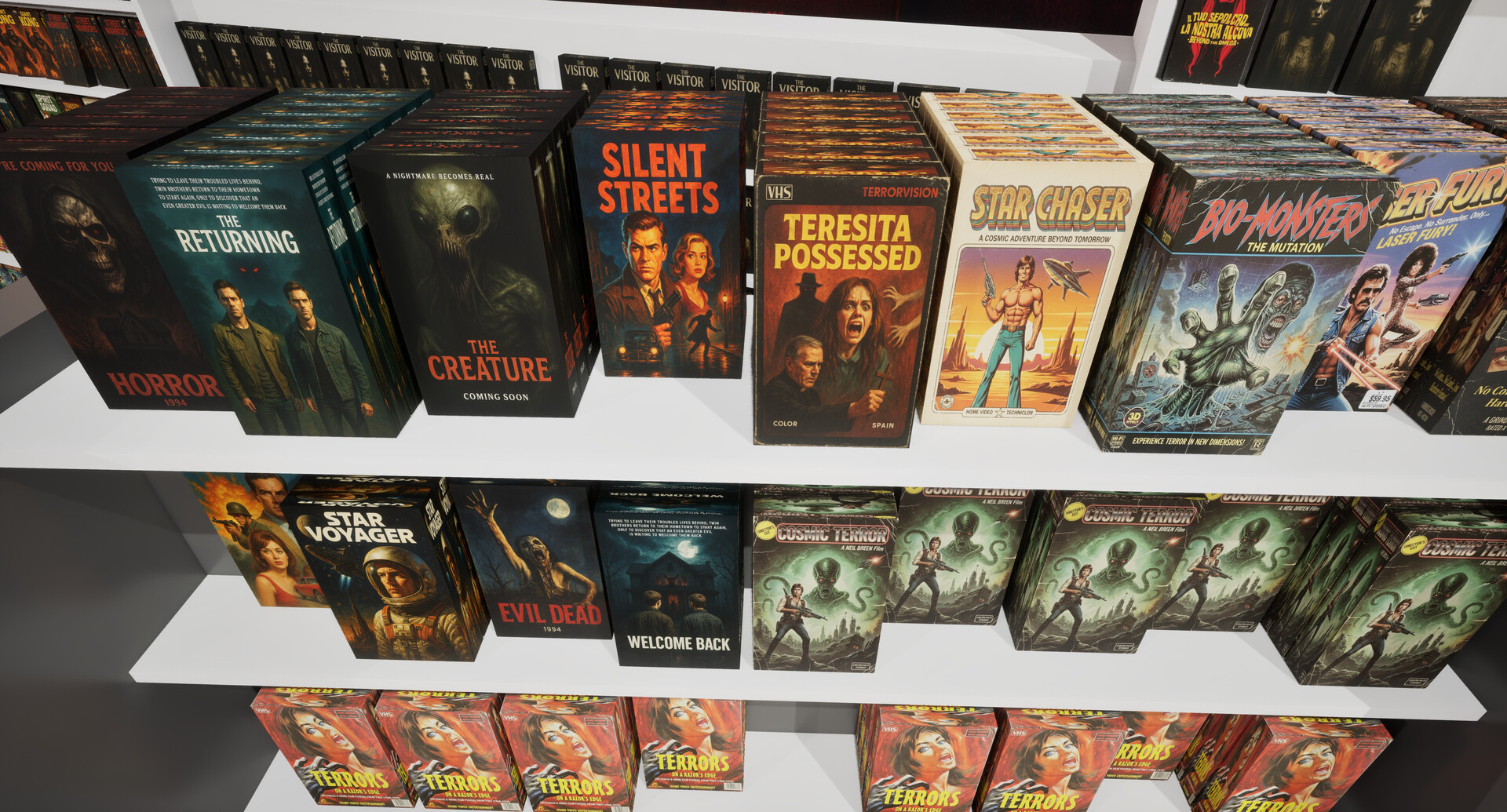 Explore a detailed 3D environment designed to capture the feeling of being inside a real video store. From shelves and displays to back rooms and surrounding spaces, every part of the store is meant to feel tangible, lived-in, and reactive to how you play.
