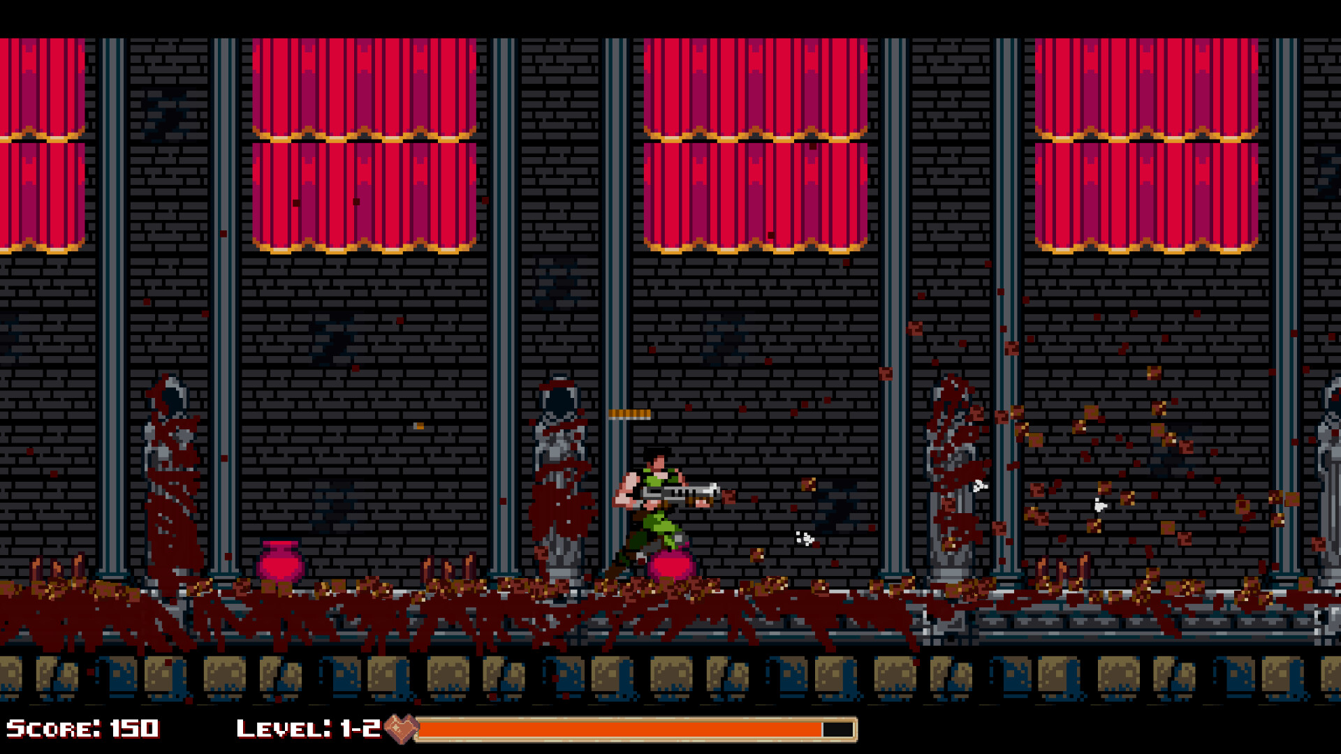 BloodSpiller is a retro-action platformer that blends classic visuals and game play with modern flair and attitude,  Destroy Dracula and his minions using overwhelming fire power. Paint the town red and you blast through dozens of monsters, bosses, to eventually fight the big man himself.