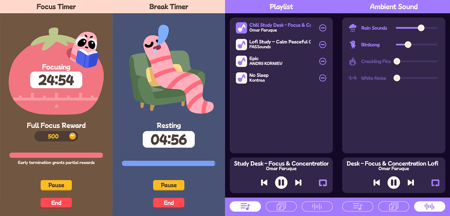 • 【Productivity Tools】: Built-in Pomodoro Timer and Music Player. Let the worm keep you company during every focused work session.