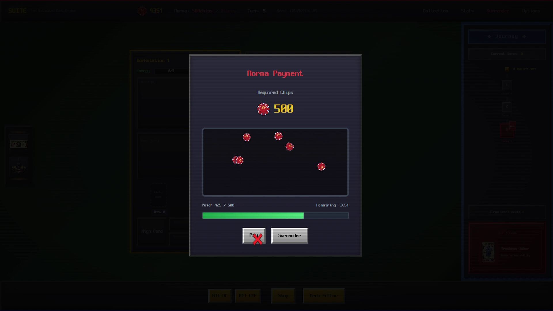SUITE: Automated Card Engine is a poker roguelike game. Run countless workshops, wield broken cards and bizarre Jokers, create dozens of unique poker hands, and earn chips on your way to becoming unbelievably rich.