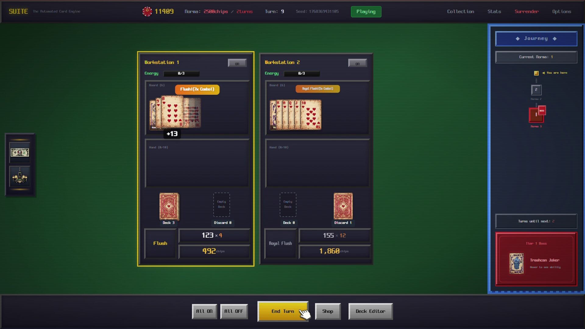 SUITE: Automated Card Engine is a poker roguelike game. Run countless workshops, wield broken cards and bizarre Jokers, create dozens of unique poker hands, and earn chips on your way to becoming unbelievably rich.
