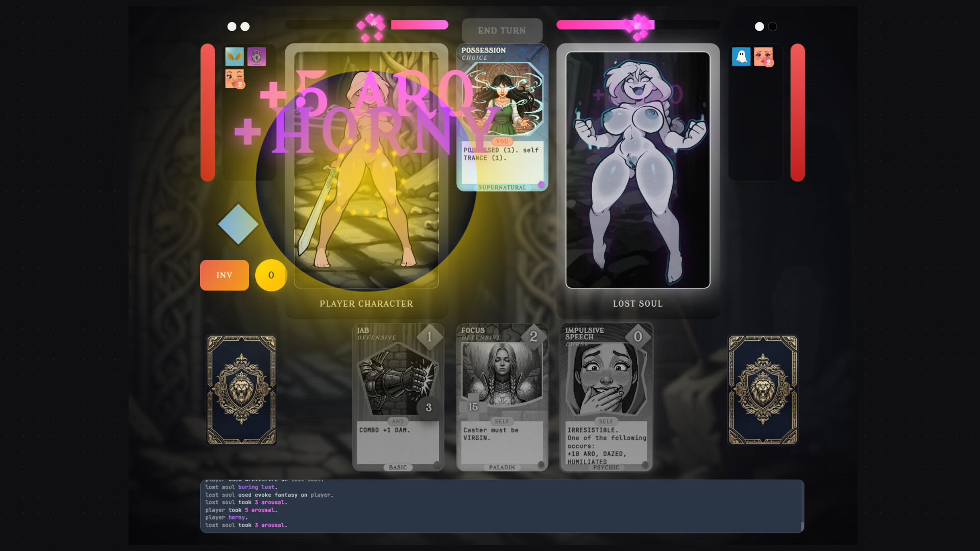 • Manage HP, arousal, energy, card draw, and long-term corruption