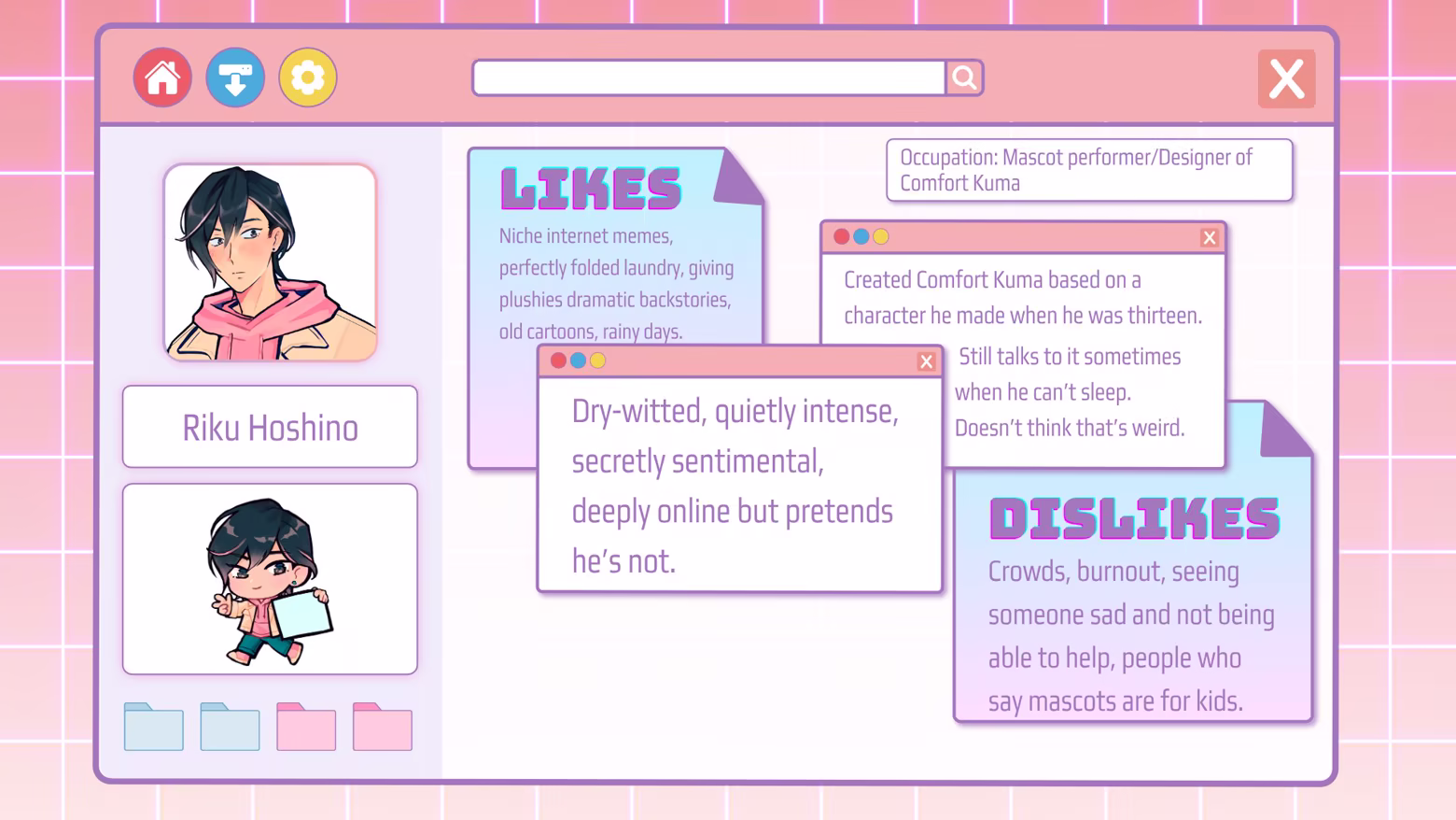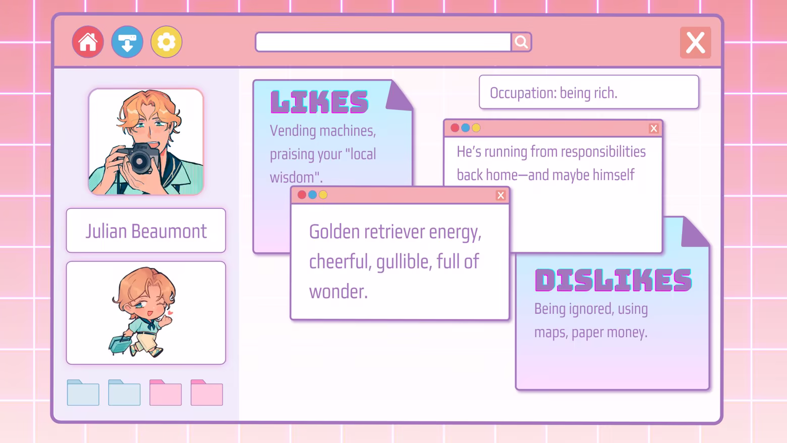Spend 4 days with 2 boy failures in this otome visual novel. Will you choose Julian, the lost tourist with golden retriever energy, or Riku, the quietly intense guy in a bear suit, to steal your heart in this short & sweet romance?
