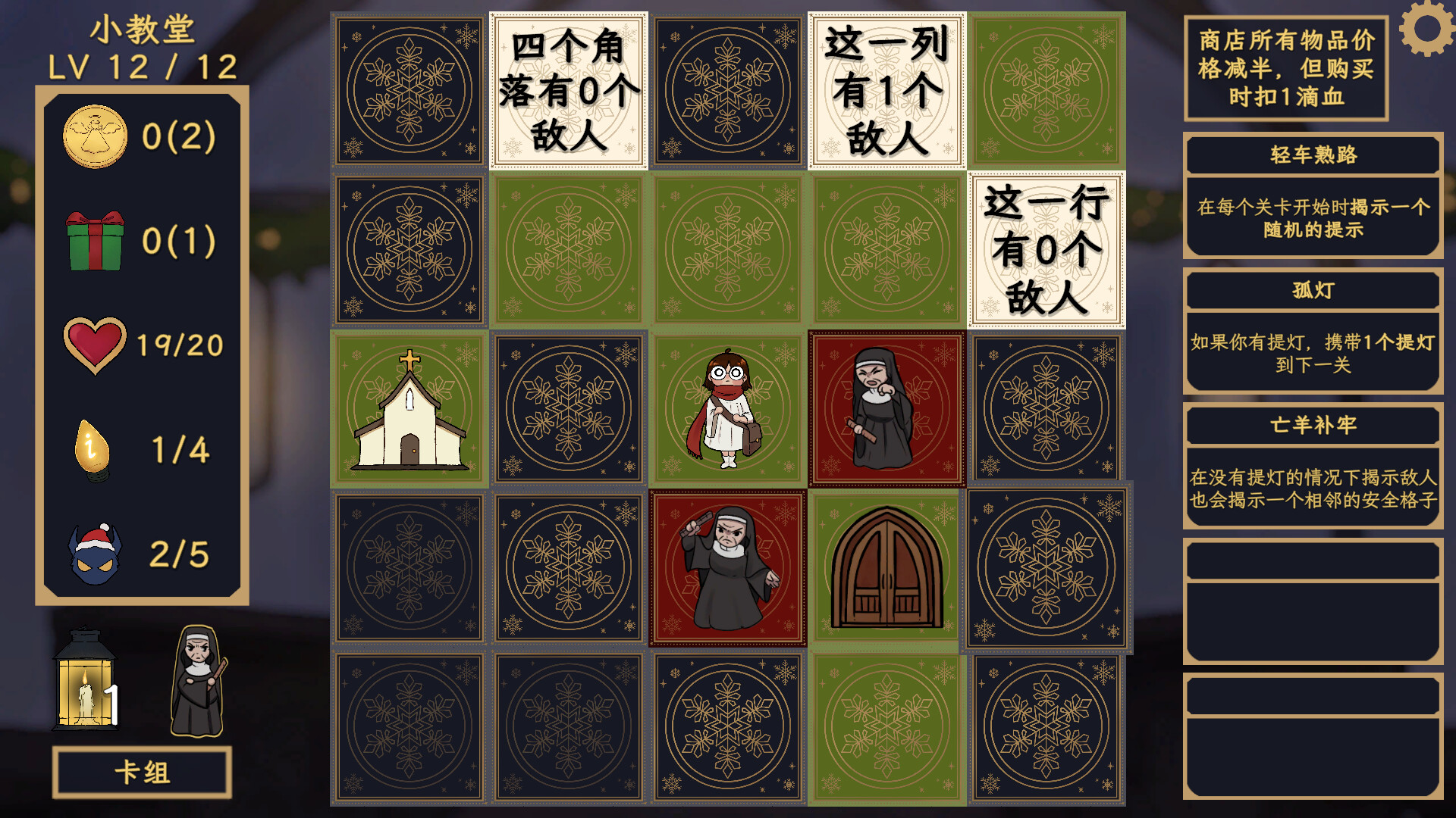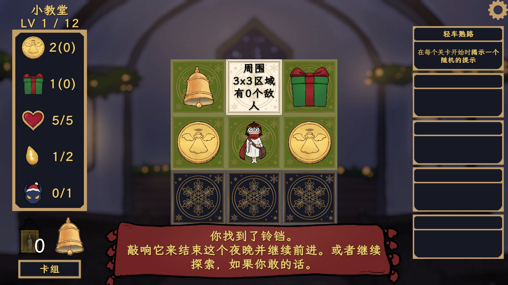 在每一关开始前,你需要选择并构建牌组,决定棋盘上可能出现的内容——奖励、道具与其他事件。在探索过程中,你需要根据提示猜测敌人的位置,谨慎决定翻开哪些格子、承担多大的风险,以及是否该敲响铃铛安全离开。
