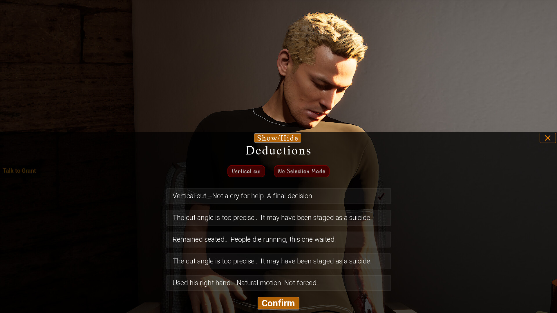 A narrative-driven detective thriller. Reed and partner Grant investigate a murder case that resets through a time loop. Gather clues, interrogate witnesses, build timelines in the mind palace, and uncover the truth through deduction and multiple endings.
