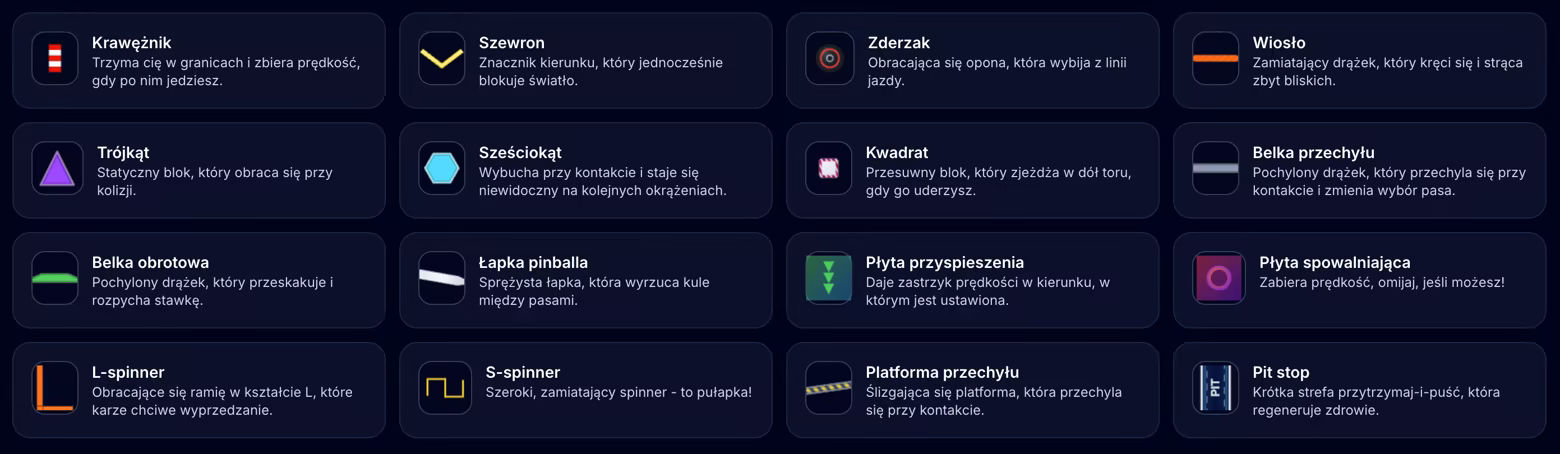Przeszkody to statyczne i ruchome przeszkody, które zmieniają tempo wyścigu, a kształty to bloki definiujące tory, krawędzie i skróty.
