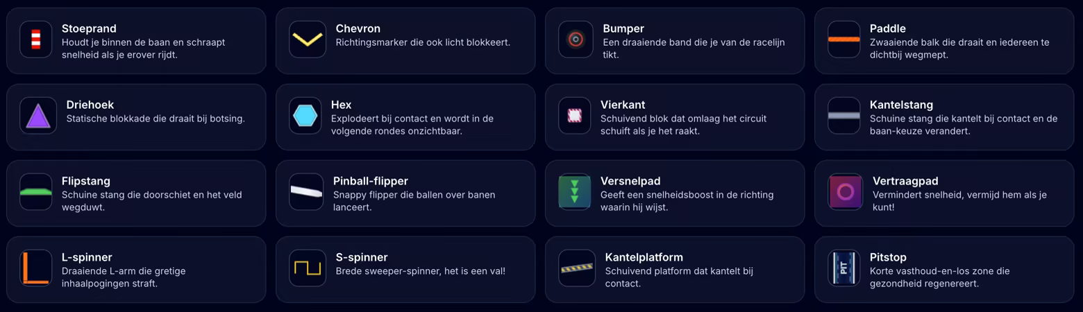 • Dynamische obstakels en gevaren langs de baan die het tempo van de race veranderen