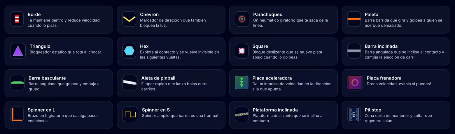 • Obstáculos dinámicos y peligros en la pista que cambian el ritmo de la carrera