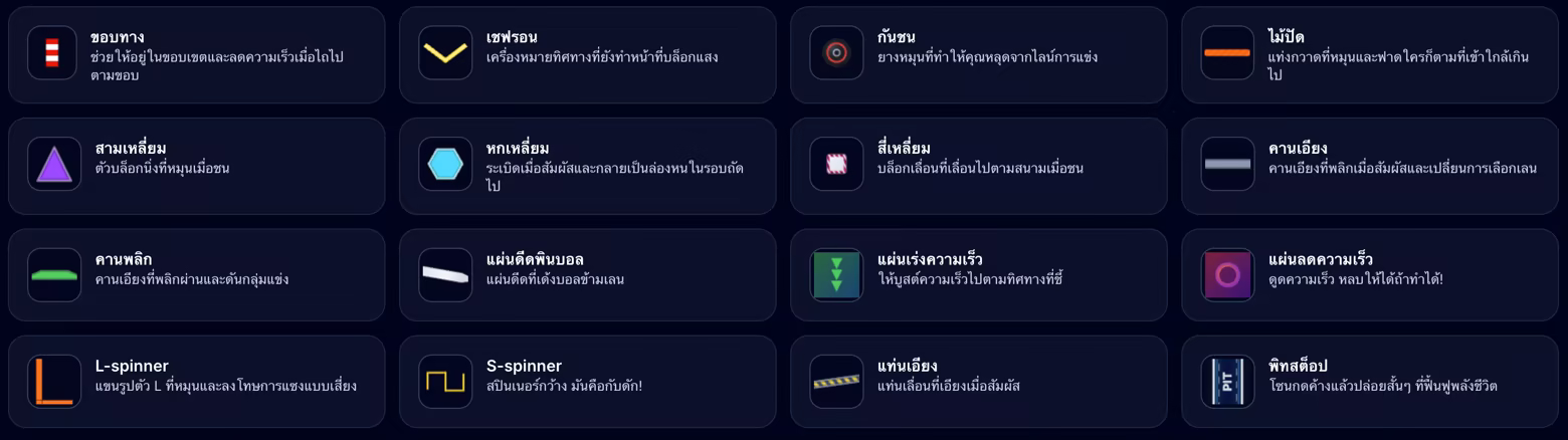 อุปสรรคคือภัยคุกคามทั้งแบบคงที่และเคลื่อนที่ ซึ่งเปลี่ยนแปลงจังหวะการแข่งขัน ในขณะที่รูปทรงคือบล็อกที่กำหนดเลน ขอบ และทางลัด