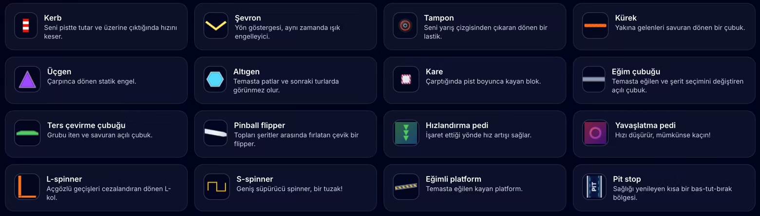 Engeller, yarışın temposunu değiştiren statik ve hareketli tehditlerdir; şekiller ise şeritleri, kenarları ve kısayolları tanımlayan bloklardır.