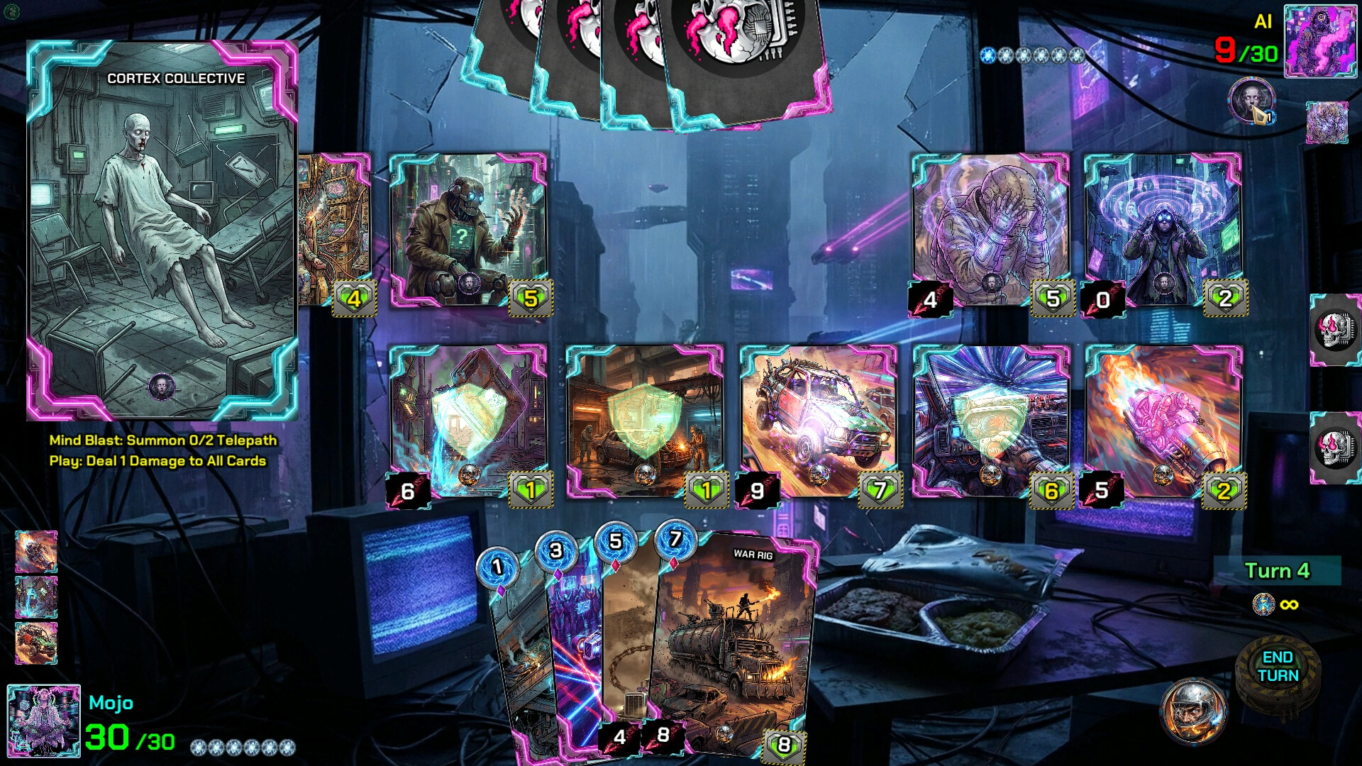 • Cortex Collective: Unstable psychics with bleeding brains. Unleash a "Psionic Scream" to summon a Telepath unit that immediately deals damage to ALL cards on the board—friend and foe alike.