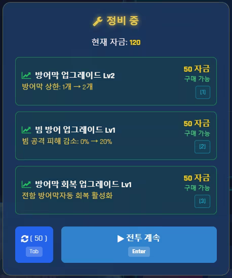 전투의 난이도는 점수가 올라감에 따라 점차 높아집니다. 난이도가 올라갈 때마다 정비 기회를 얻습니다. 정비에서 원하는 강화 방향을 선택하여 업그레이드할 수 있습니다. 물론 업그레이드에 필요한 자금은 전투에서 적 전함을 처치하여 얻어야 합니다.