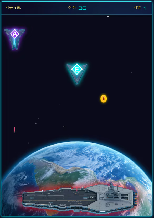 게임이 시작되면 게임 영역에 적 우주 전함이 계속 나타납니다. 적 전함은 공격하면서 아군 함선으로 돌진하고, 충돌하면 자폭합니다. 아군 함선에는 방어막이 있어 적의 총알 공격을 효과적으로 방어할 수 있지만, 적의 자폭은 방어막 하나를 쉽게 파괴할 수 있습니다.