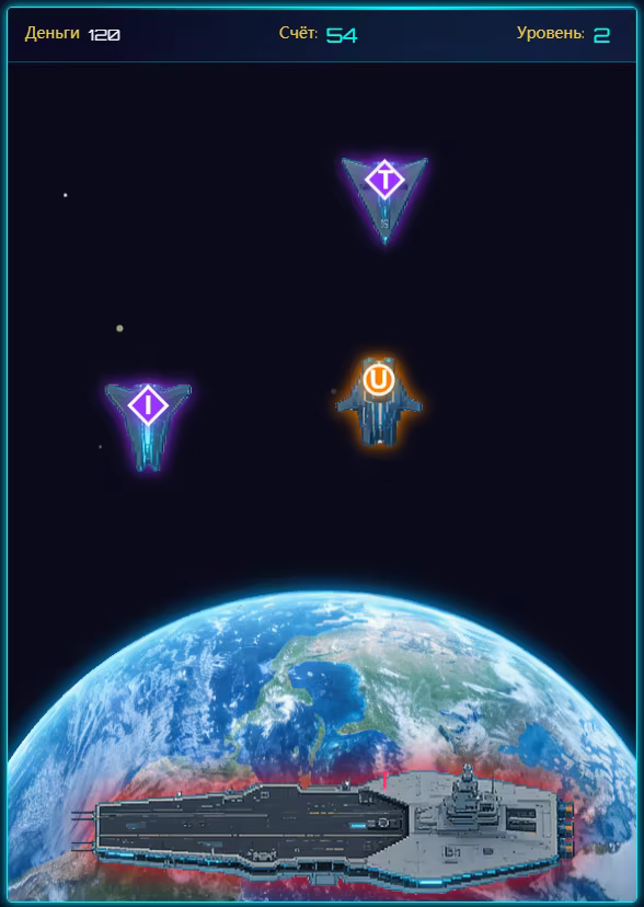 После начала игры в игровой зоне постоянно появляются вражеские космические корабли. Они атакуют и несутся на ваш корабль. При столкновении с вашим кораблем вражеский корабль самоликвидируется. Ваш корабль имеет щит, который эффективно защищает от вражеских пуль, но самоликвидация врага может легко уничтожить один из ваших щитов.