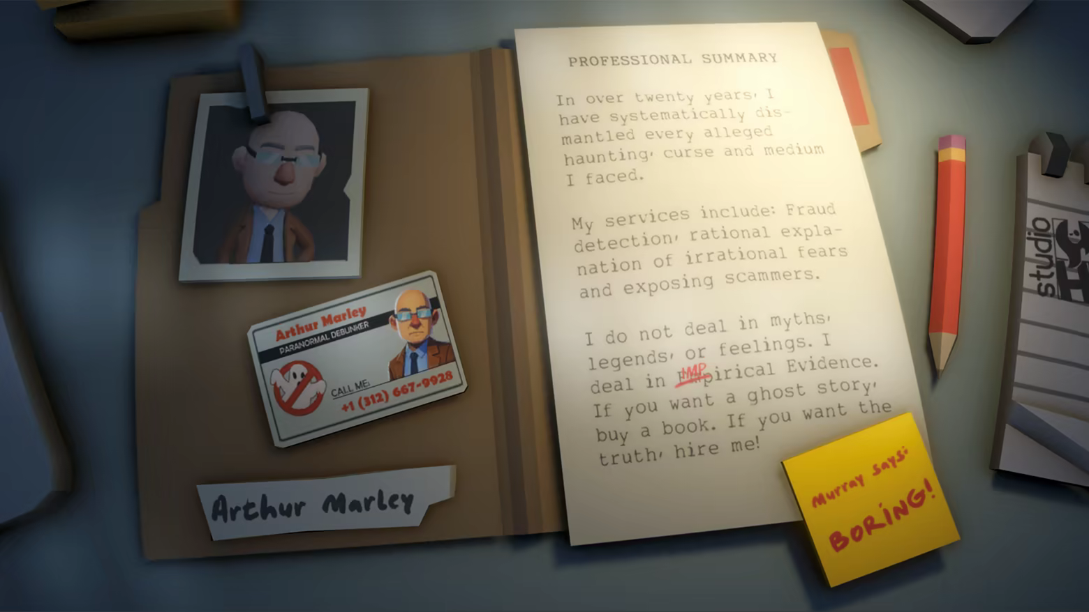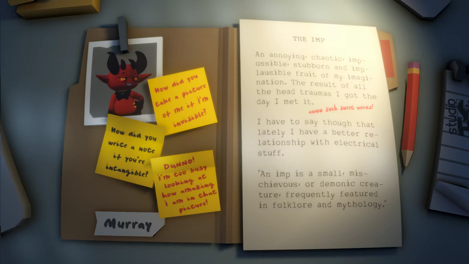 A comedy adventure game featuring classic inventory based puzzles. Arthur is a skeptic who dedicated his life to denying the paranormal. Murray is the electric Imp he accidentally summoned. Now Arthur must solve mysteries while bound to the very evidence of the supernatural itself.