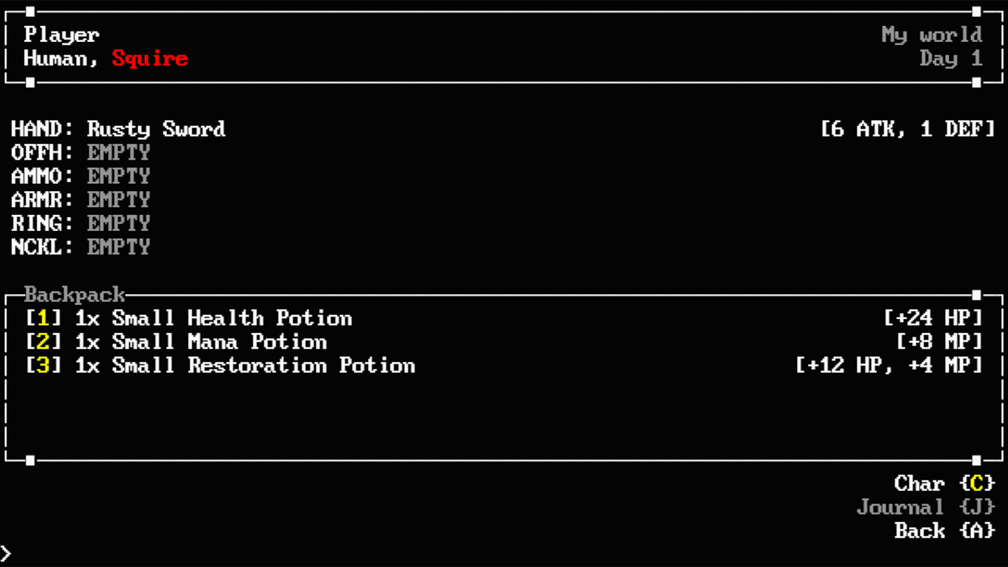 Explore, discover and live your fantasy on this ASCII RPG adventure! Create your character, choose your race, class and go on an epic adventure, leveling up, collecting loot, building reputation and fighting enemies on a combo system turn based combat. All that while enjoying an awesome soundtrack.