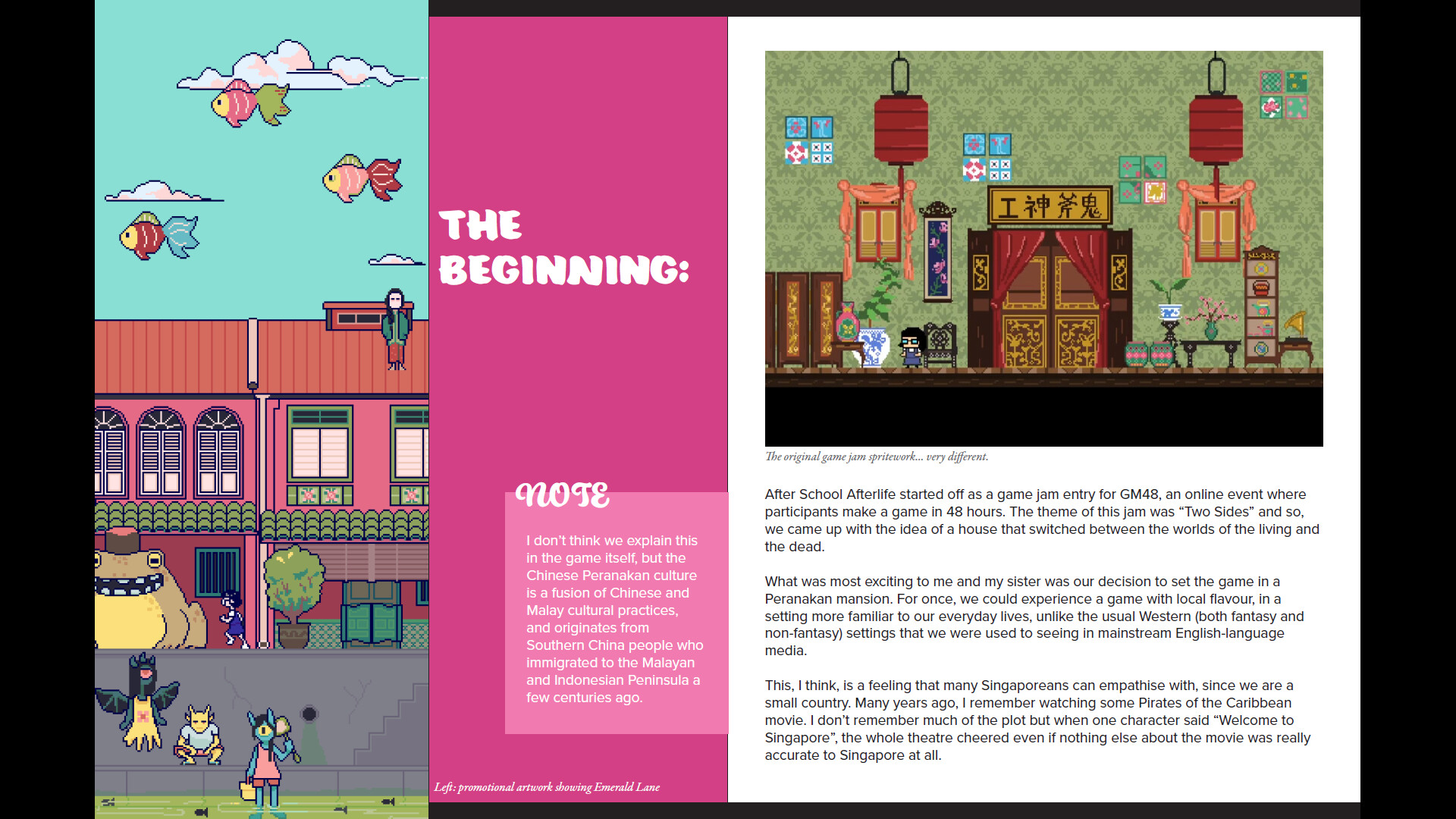 Take a look behind the curtain at the development of After School Afterlife. Filled with stories from Happysquared's past growing up in Singapore, this book will be your guide to the background and cultural references found in the game.