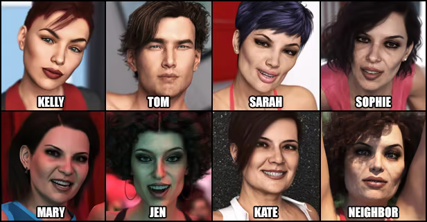 In addition to Kelly and Sarah, we will find friends like the wacky Sophie, the mysterious neighbor, Kate, Jen or Mary, curious friends with an almost uncontrollable desire who are eager to test the qualities of the kind-hearted Tom.