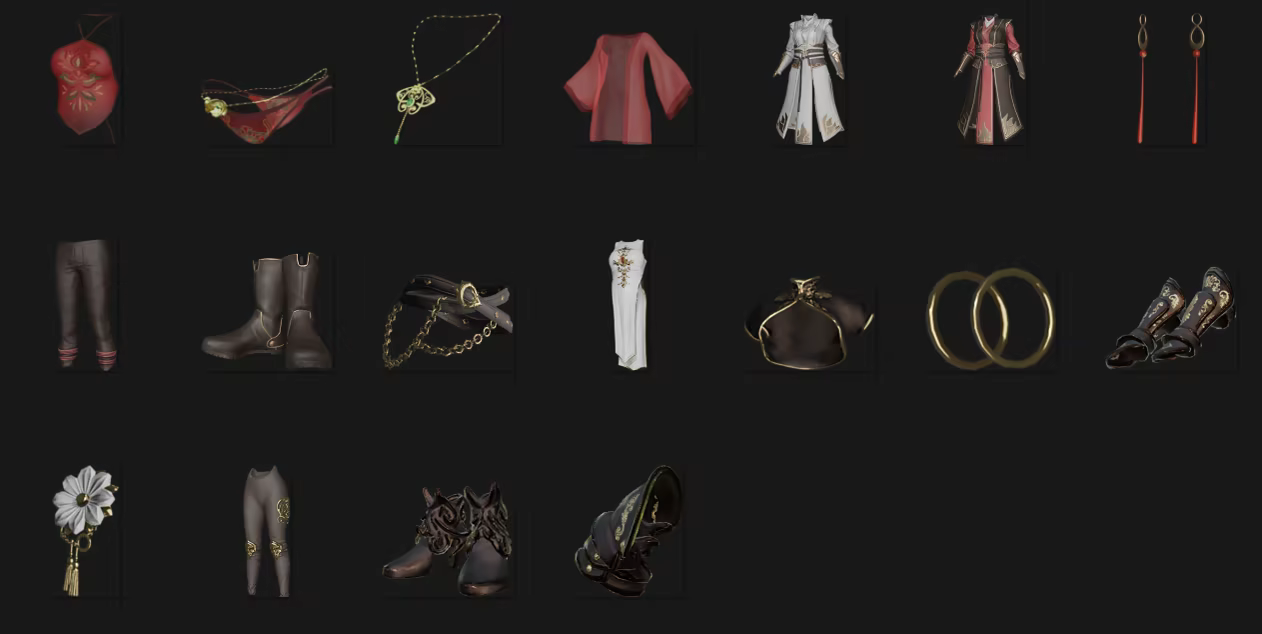This set includes 3 complete outfits in distinct wuxia styles, split into 18 pieces.
