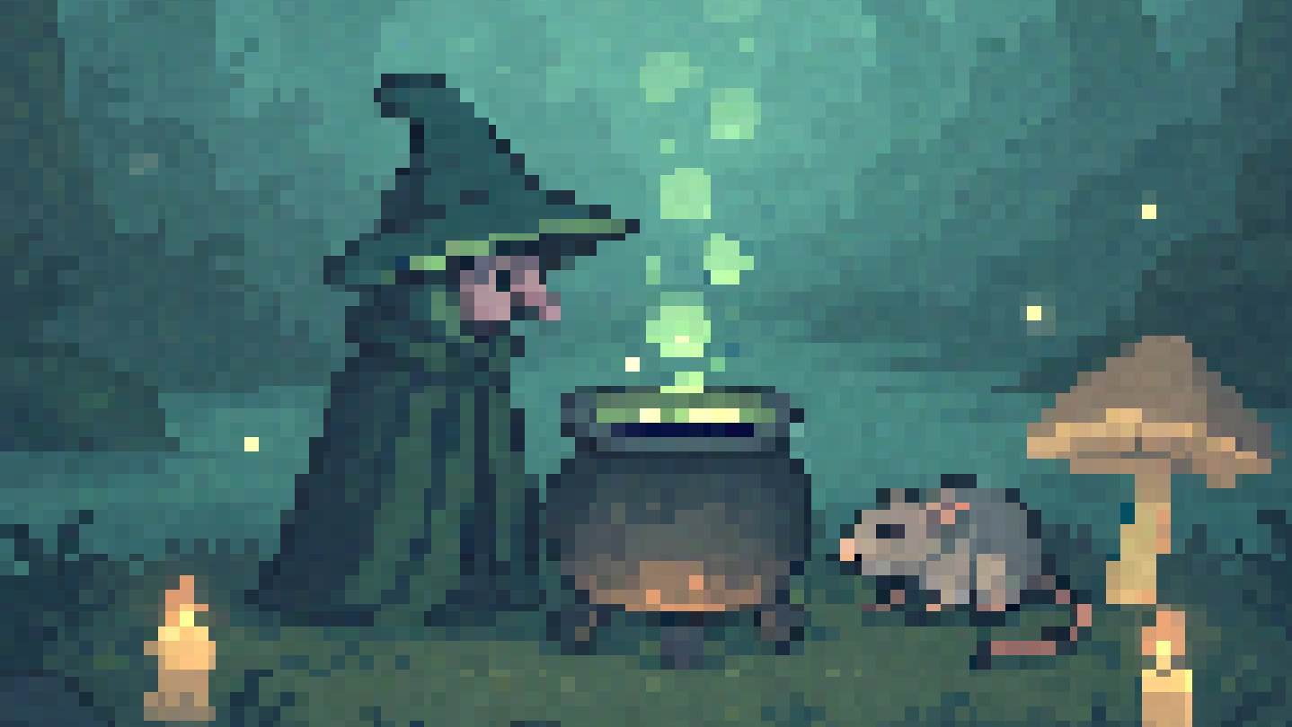 Bubble the Witch and Squeak the Rat try to defend and reclaim their swamp from nightly goblin raids in this 2D side-scrolling pixel art game.