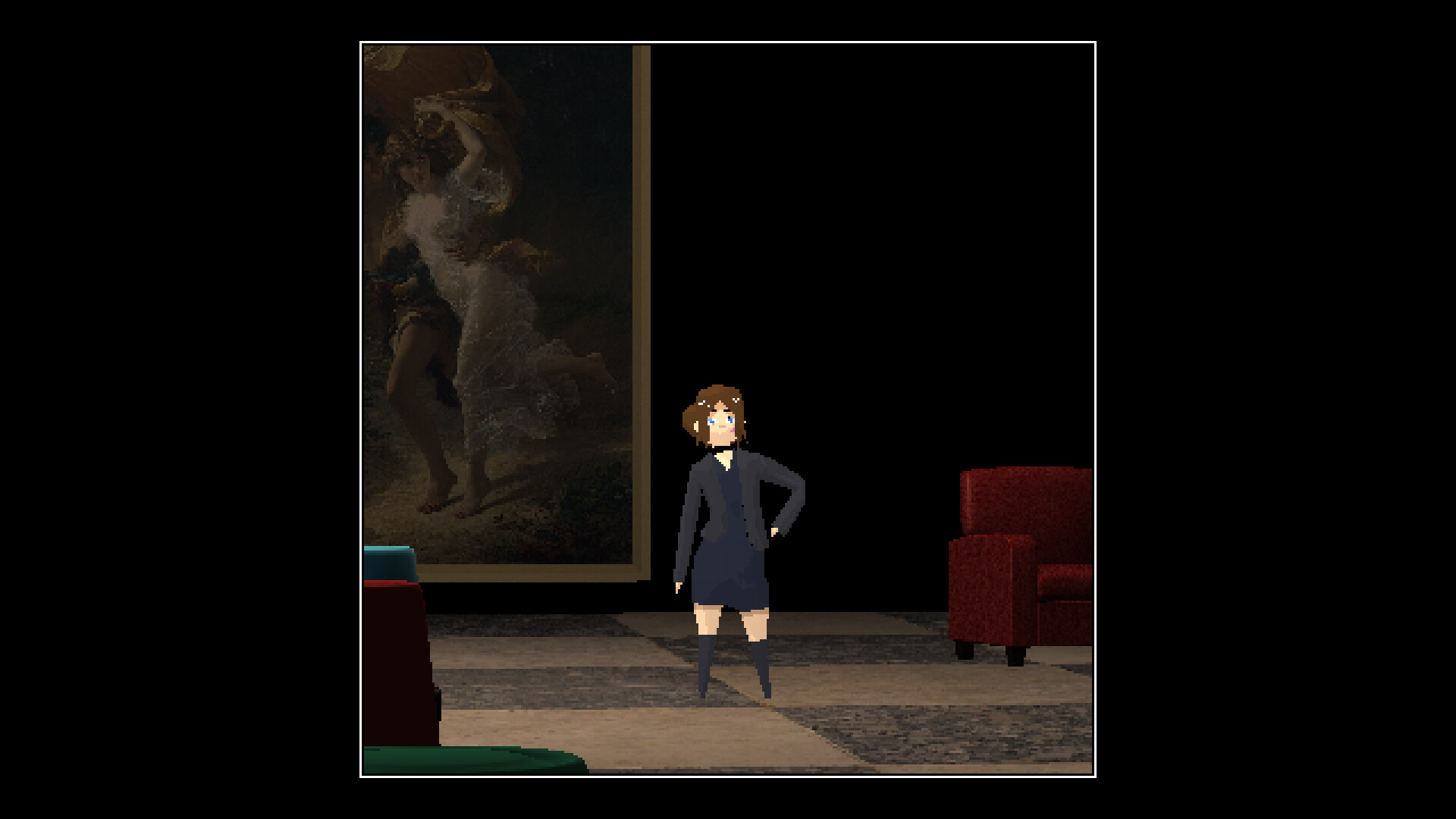 Kind of like if Luigi's Mansion and René Magritte had a baby and it was a visual novel. Am I allowed to say that? Though, only is it like this in a sort of philosophical way. Also there's a time system, so you'll have to pick and choose which person you talk to.