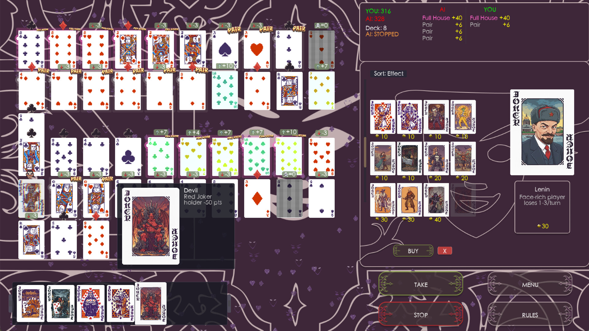 Poker meets Solitaire and… a dash of chaos! A tactical card duel with poker hands and 47 game-breaking jokers. Forget everything you knew about poker. Here, combinations are just the beginning.