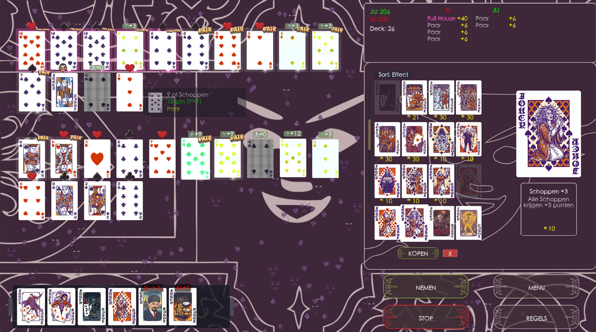 Een tactisch kaartenduel met pokerhanden en chaotische jokers Klassiek poker ontmoet strategische waanzin. Bouw combinaties, beheer jokers, versla de AI.