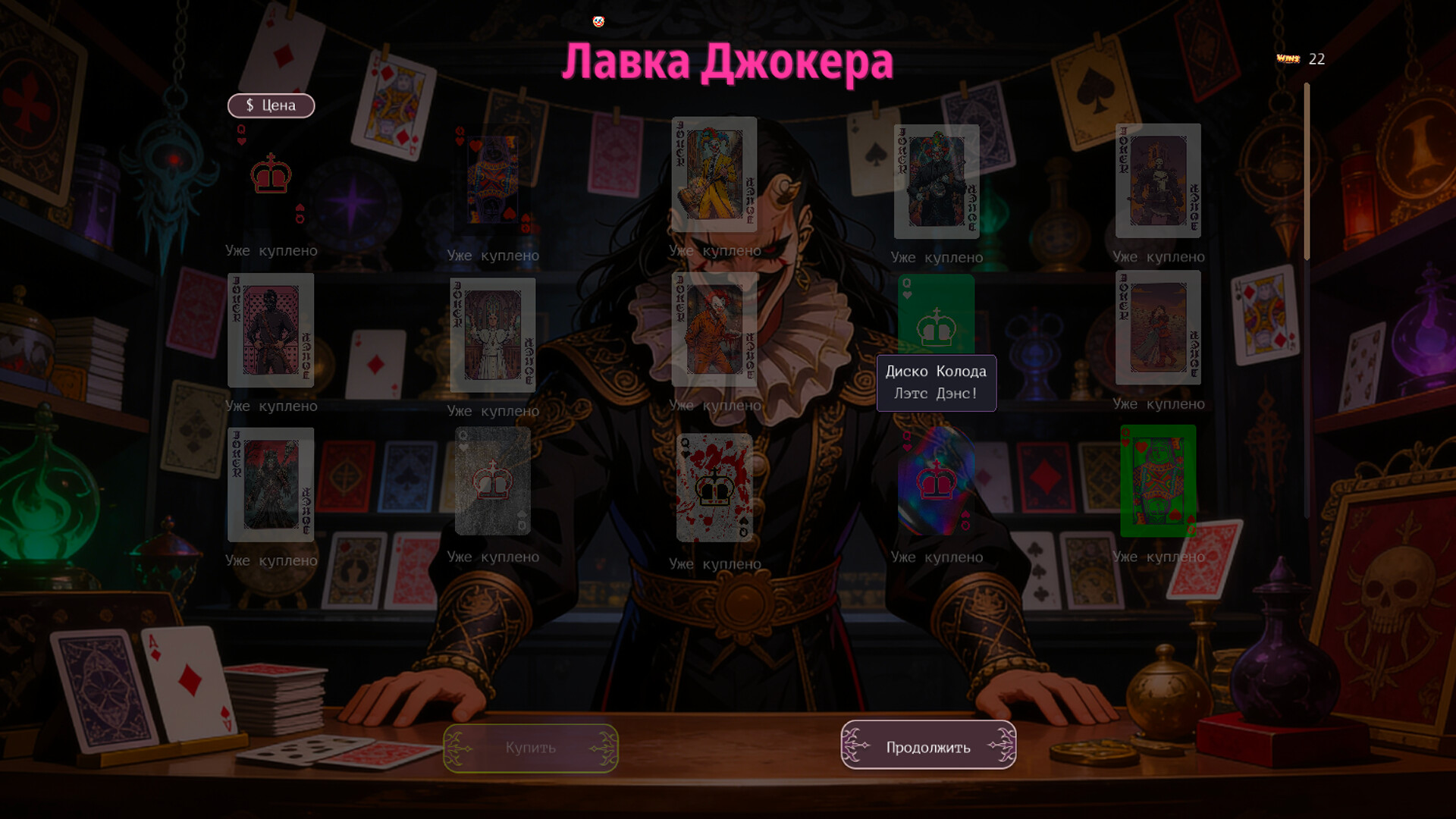 Между раундами — магазин, где за заработанные очки можно купить новых джокеров. Но цены растут с каждой покупкой! Чем больше берёшь — тем дороже следующий. Бездумный шопинг приведёт к тому, что к концу матча ты не сможешь позволить себе ничего. Планируй покупки с умом.