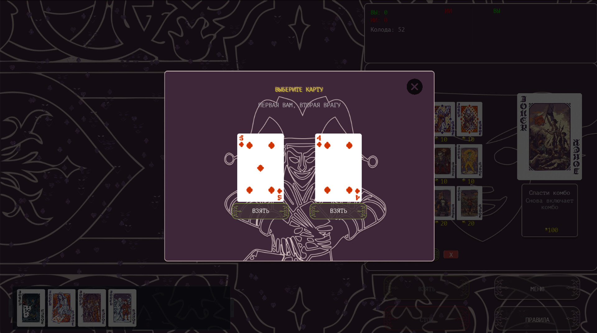 Как играть: Каждый игрок получает карты из одной колоды в 54 карты. Твоя задача — набрать больше очков, чем AI. Очки приносят номиналы карт и бонусы за покерные комбинации. Но вот в чём подвох: джокеры меняют всё.