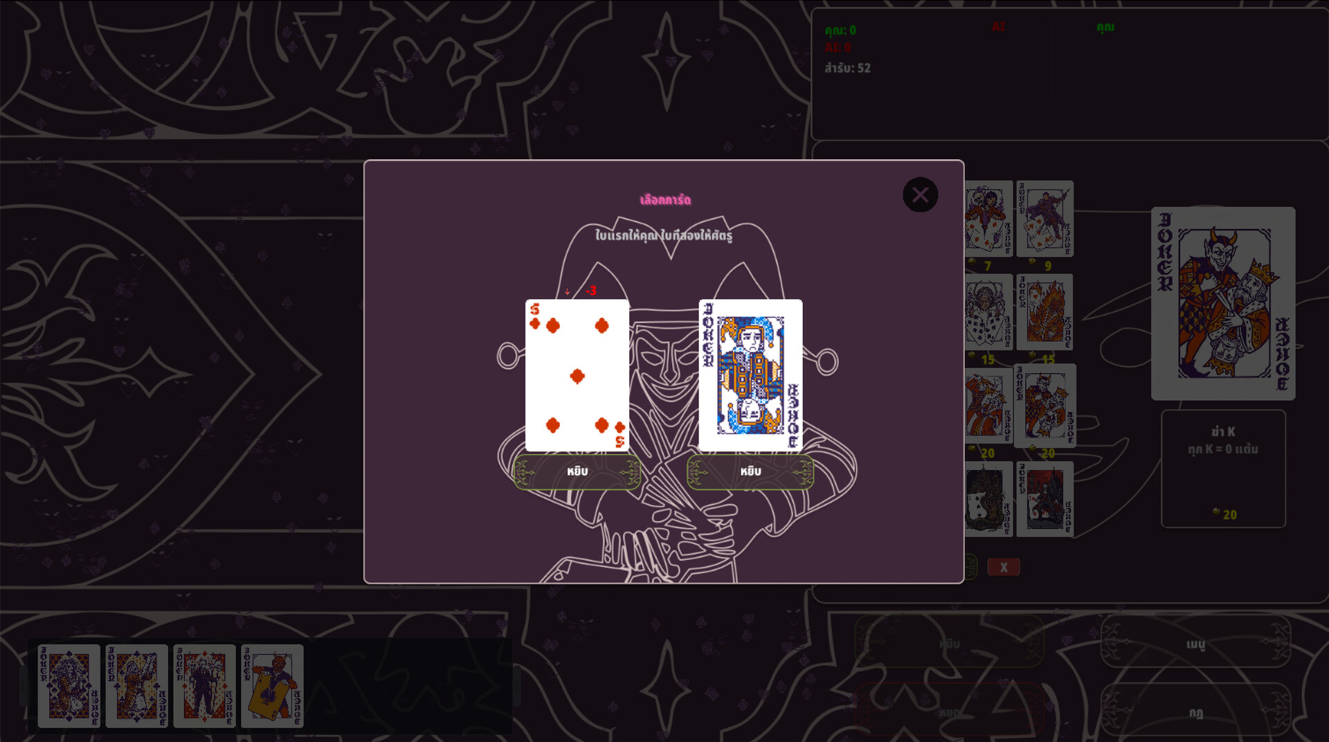 วิธีเล่น: ผู้เล่นแต่ละคนจั่วไพ่จากสำรับเดียวกัน 54 ใบ เป้าหมาย — ทำคะแนนมากกว่า AI คะแนนมาจากค่าการ์ดและโบนัสคอมโบโป๊กเกอร์ แต่นี่คือกับดัก: โจ๊กเกอร์เปลี่ยนทุกอย่าง
