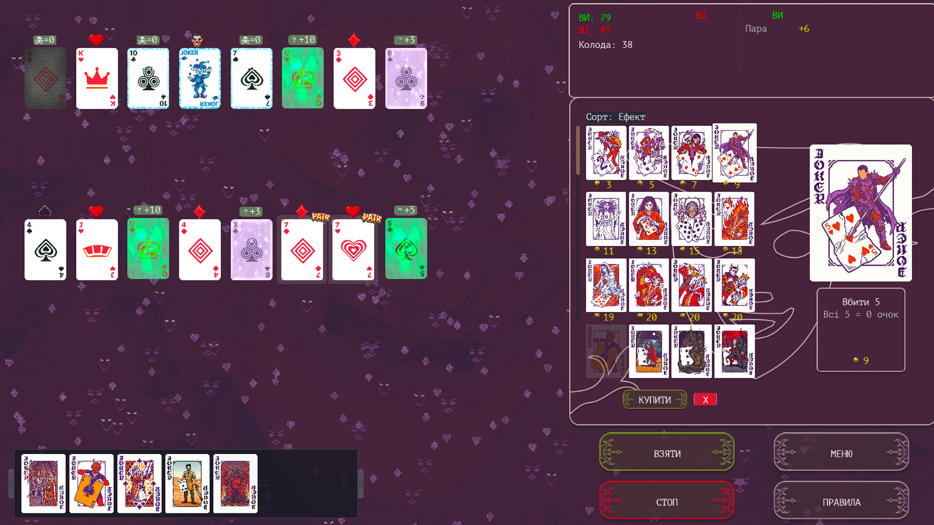 Драфт і магазин: Перед кожною партією — драфт джокерів. Ти і AI по черзі вибираєте, хто приєднається до вашої гри. Між раундами — магазин, де можна купити нових джокерів за зароблені очки.