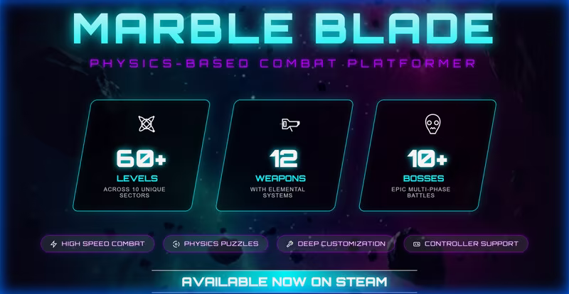 Solo indie developer. What started as a simple game for a 3-year-old is now a hardcore physics-combat RPG. Customize your marble, equip massive weapons like the Graviton Lance, and survive an accidental bullet-hell masterpiece.