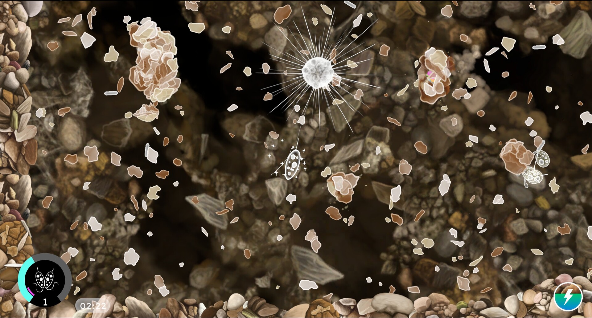 The ecosystem around you has been thrown into chaos, but it's slowly repairing itself. Bacteria are actively rebuilding the soil by gluing tiny particles into larger clusters, creating a more complex habitat that increases biodiversity. You'll have to navigate a continuously changing ecosystem with a variety of predators, hazards, and resources.