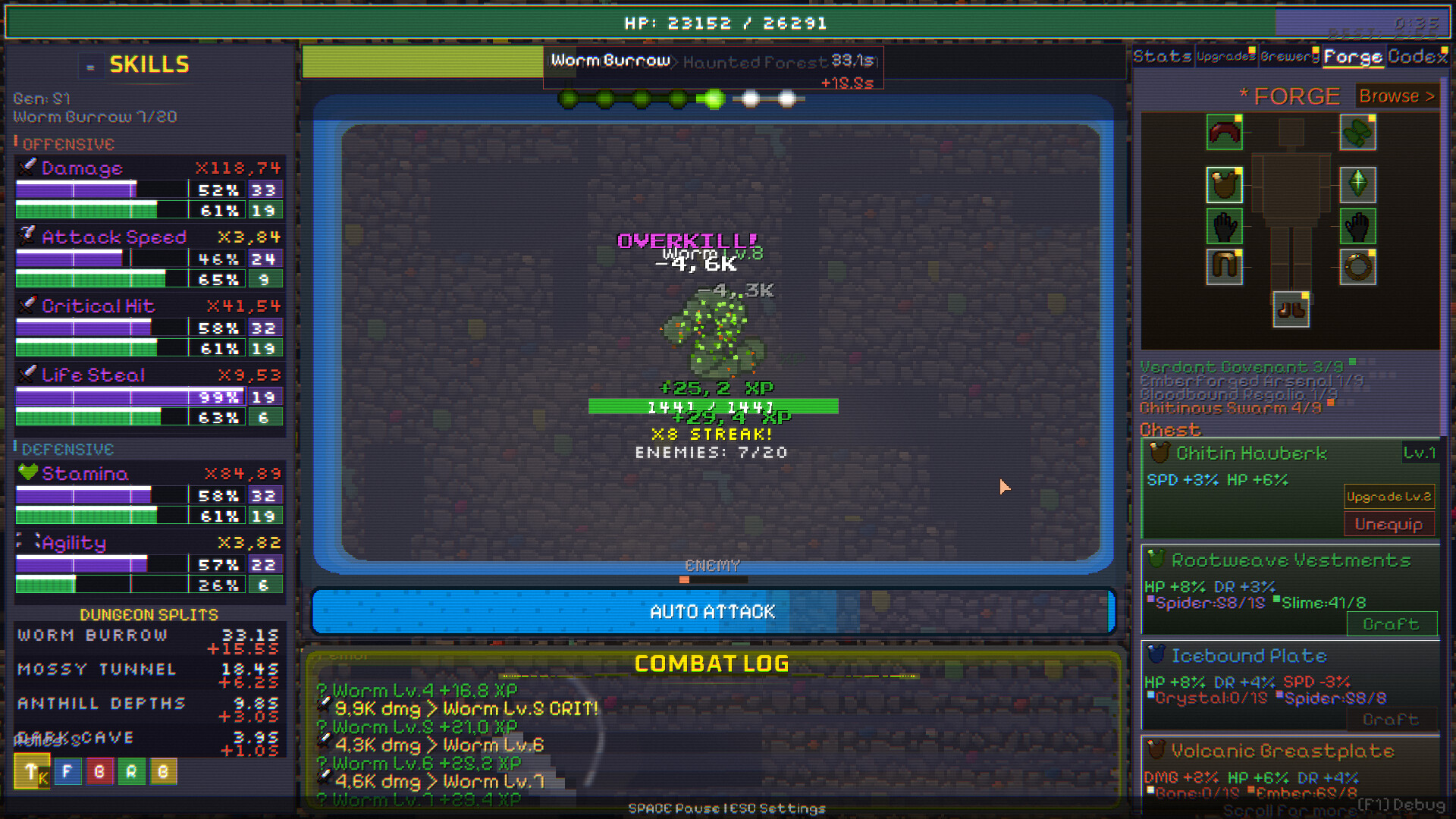 Forge equipment across 9 gear slots using loot dropped by enemies and bosses. Discover set bonuses, creature-type affinities, and archetype advantages. Some gear demands a price — trade-offs that force hard choices between raw power and survivability.