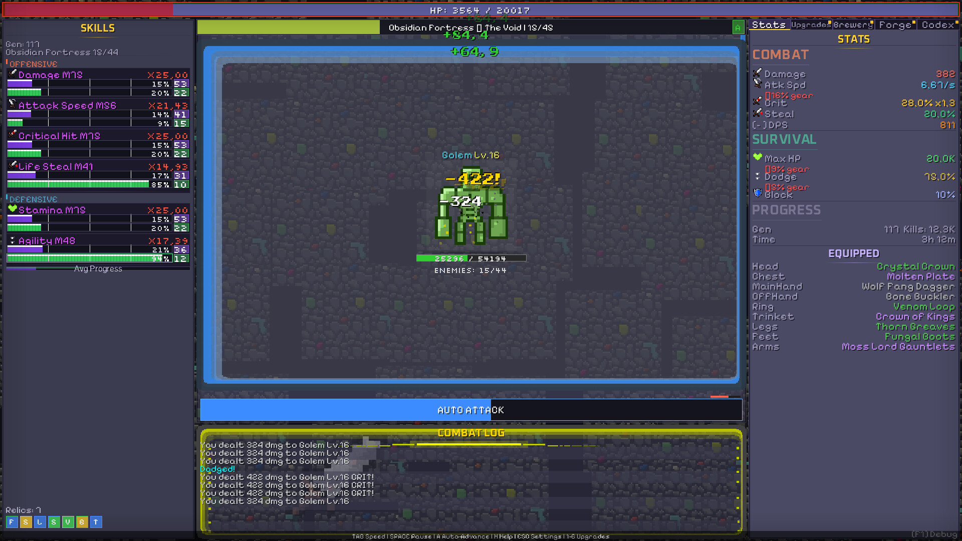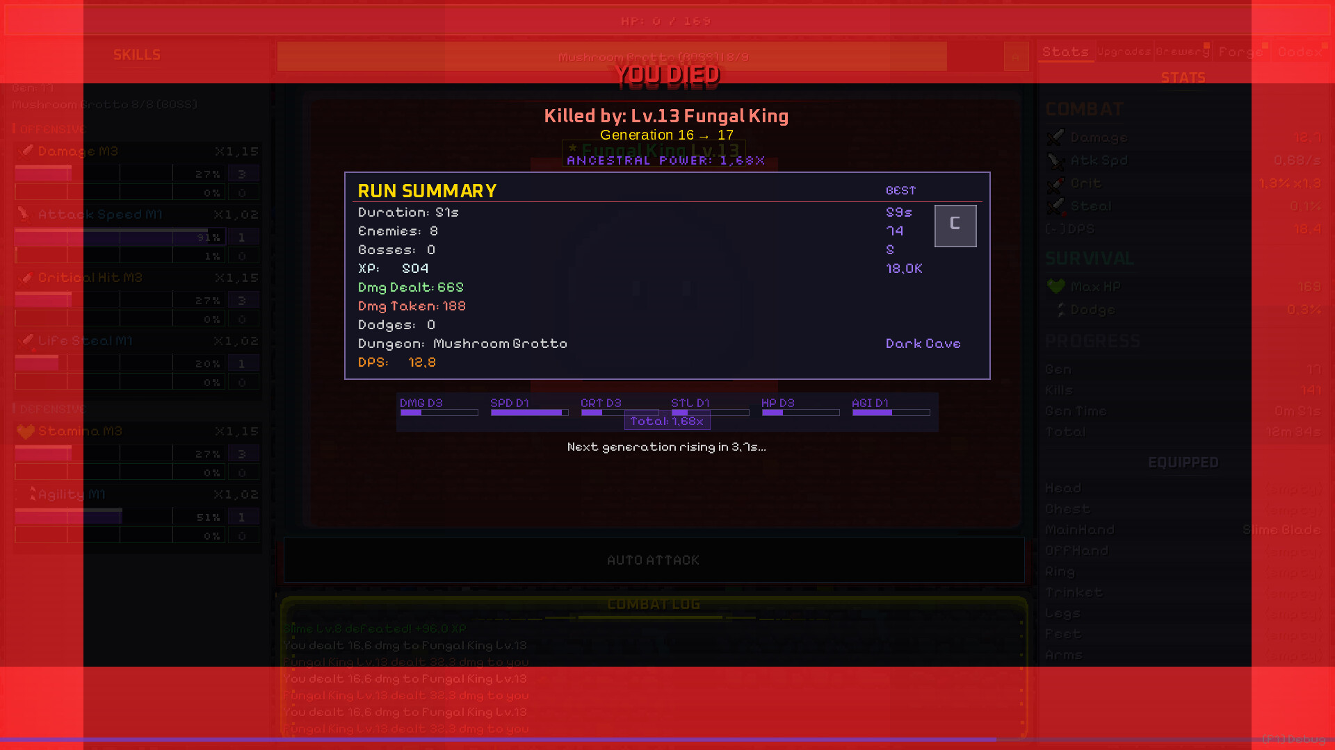 Every skill has two progress bars: a permanent **DNA bar** that persists across deaths, and a temporary **Run bar** that resets each generation. The interplay between the two creates a deeply satisfying progression loop — you're always making progress, even when you die.