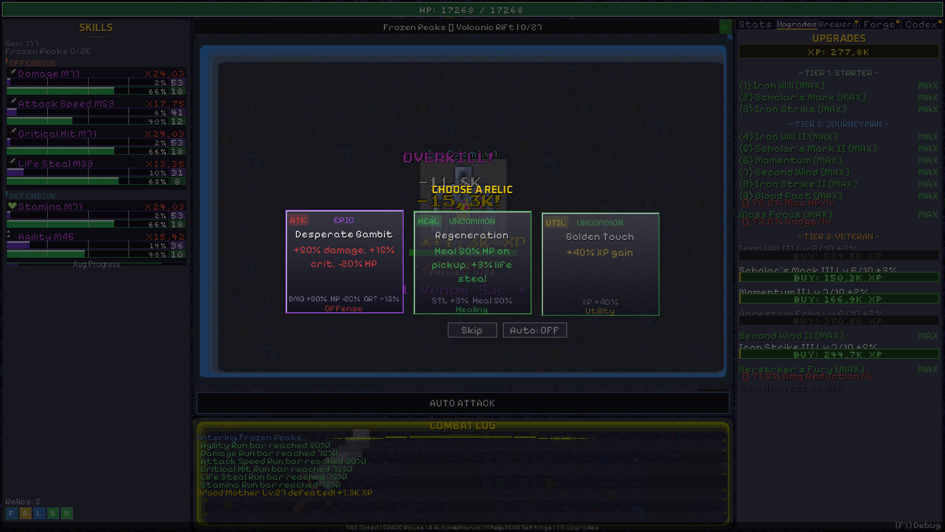 Spend XP on permanent upgrades across 3 tiers. Unlock prerequisite chains, boost HP, XP gain, click power, and more. Higher tiers unlock as you push deeper into the dungeon.