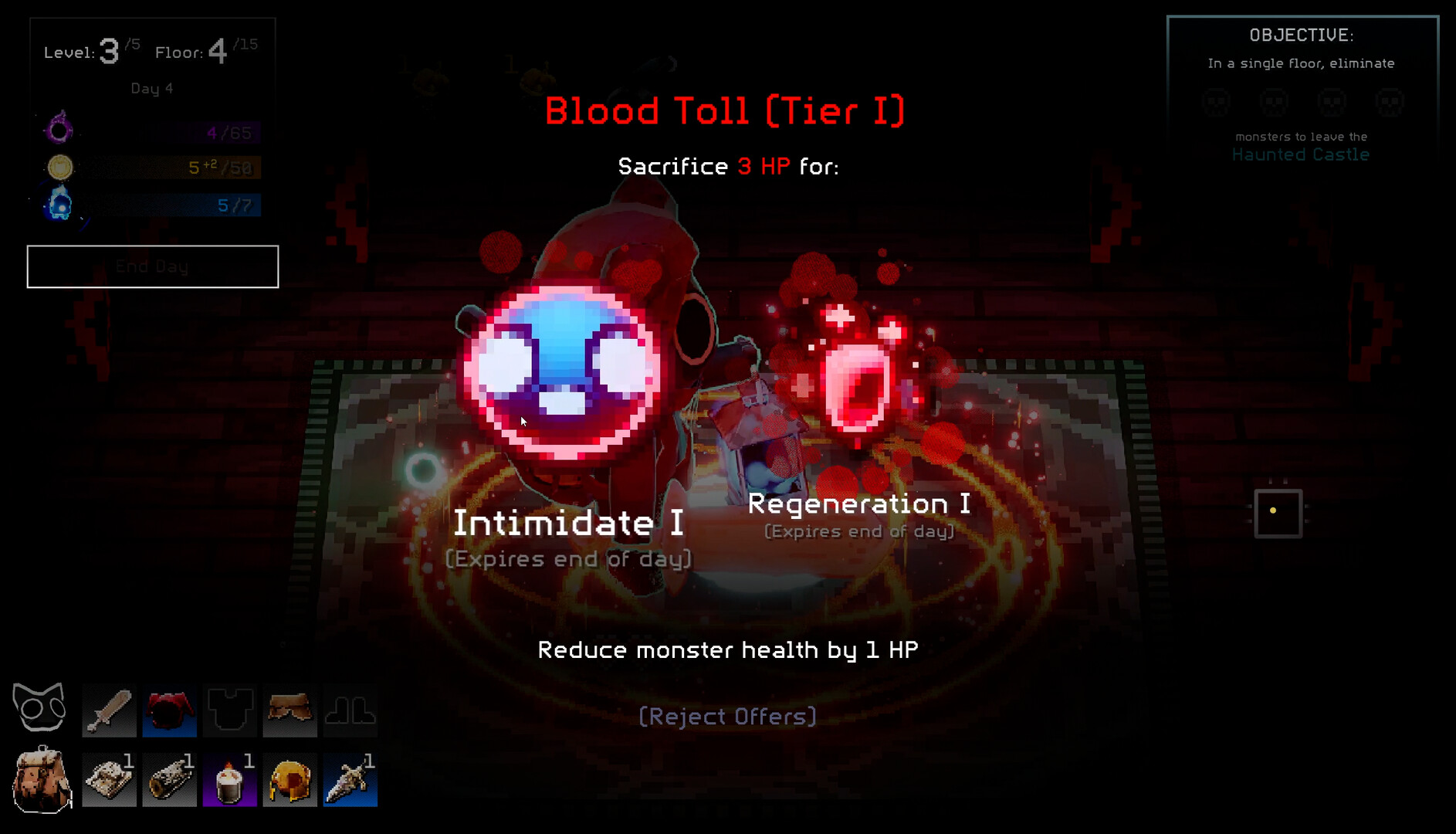 Collect equipment and items found in rooms and dropped by monsters. Selecting the right loot to synergize with your chosen cat and strategy is key to making it deeper into the dungeon.