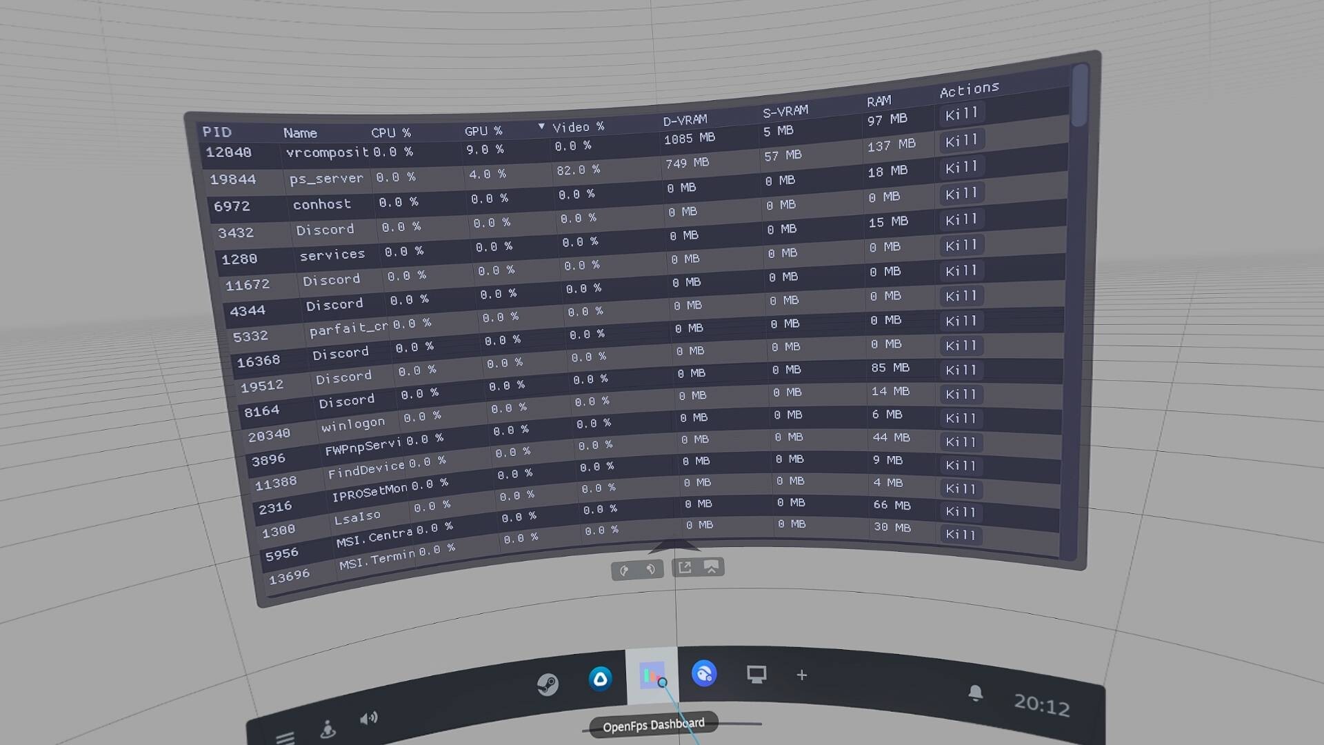 View applications currently consuming system resources directly within the SteamVR dashboard without closing your games. Displays detailed process information and allows you to terminate processes as needed.