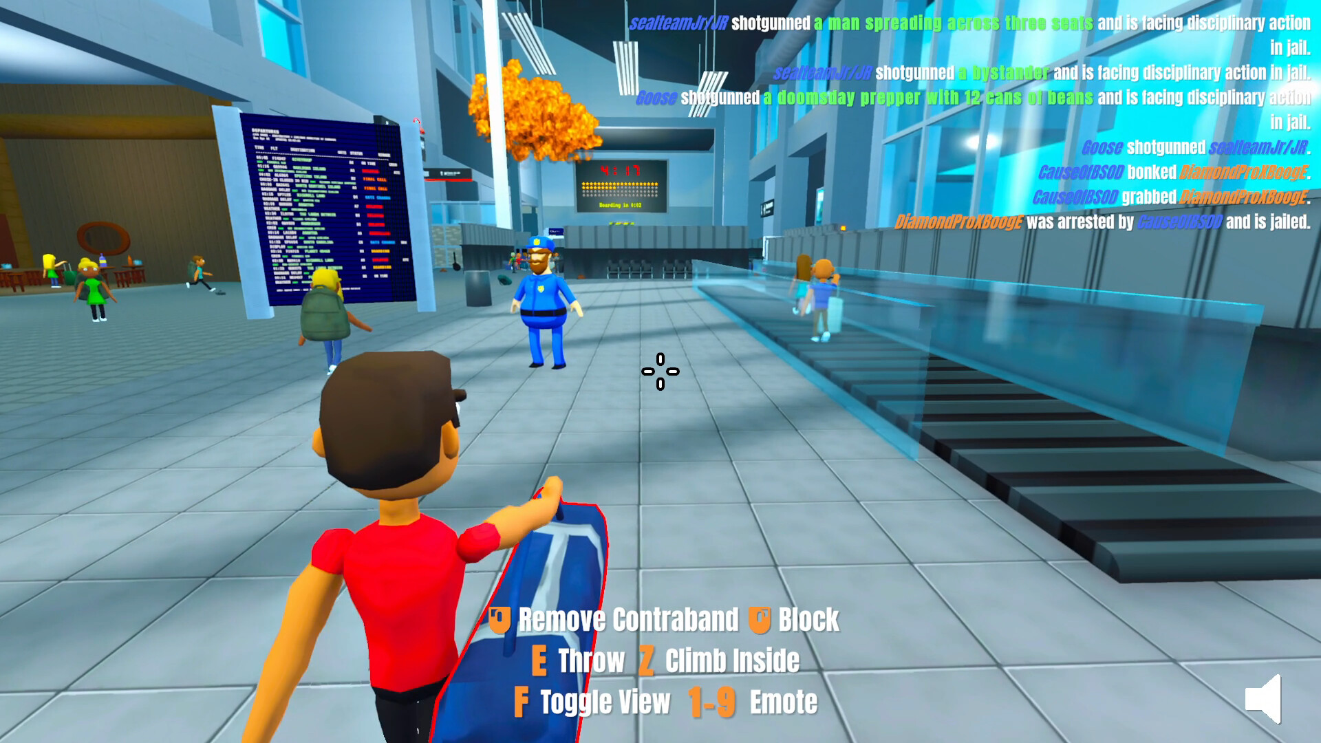 Blend in with the NPC air travelers! Before time runs out, smuggle all you can onto the plane during boarding windows. Exercise your kleptomaniac tendencies in the airport shops and find valuable contraband you can stuff into bags to hide. Collaborate with your fellow smugglers to create distractions, troll, or remain undetected. Use explosive ordinance like flashbangs, dynamite, and smoke bombs. Yoink weapons from the agent's hands or hip, and find the best escape route each round.