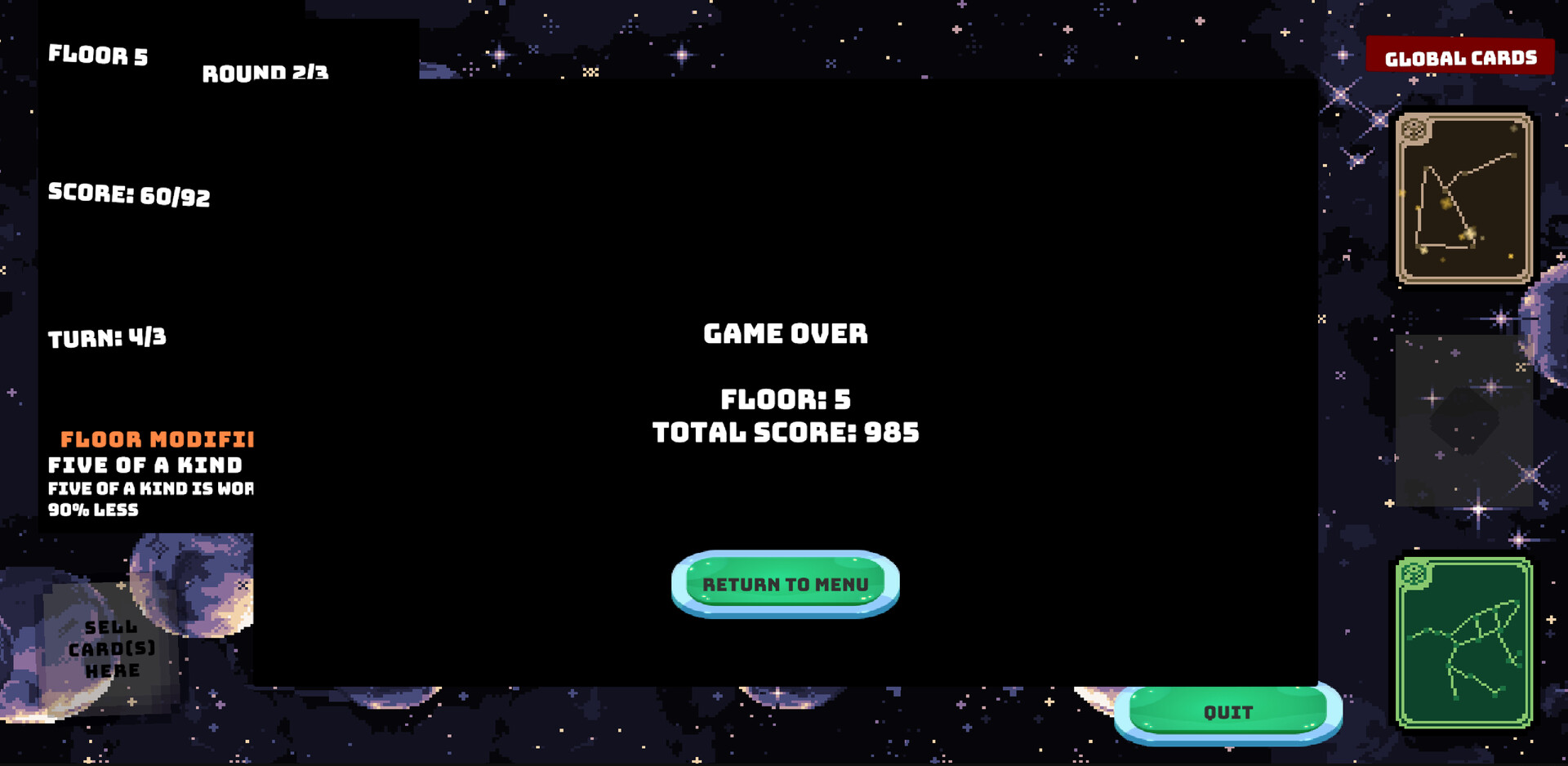 Use a multitude of: Die, Global, and Cosmic Cards to create new combos that make the highest scoring combinations that use new and interesting combos.